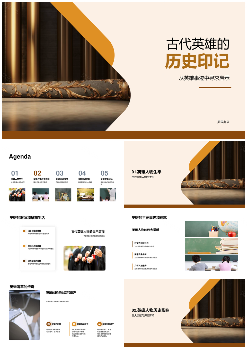 风云办公提供的古代英雄卷轴铭刻贡献启迪后世PPT模板,下载格式为pptx,一共23页,作品中文字及图均可以修改和编辑,图片更改请在作品中右键图片并更换,文字修改请直接点击文字进行修改。