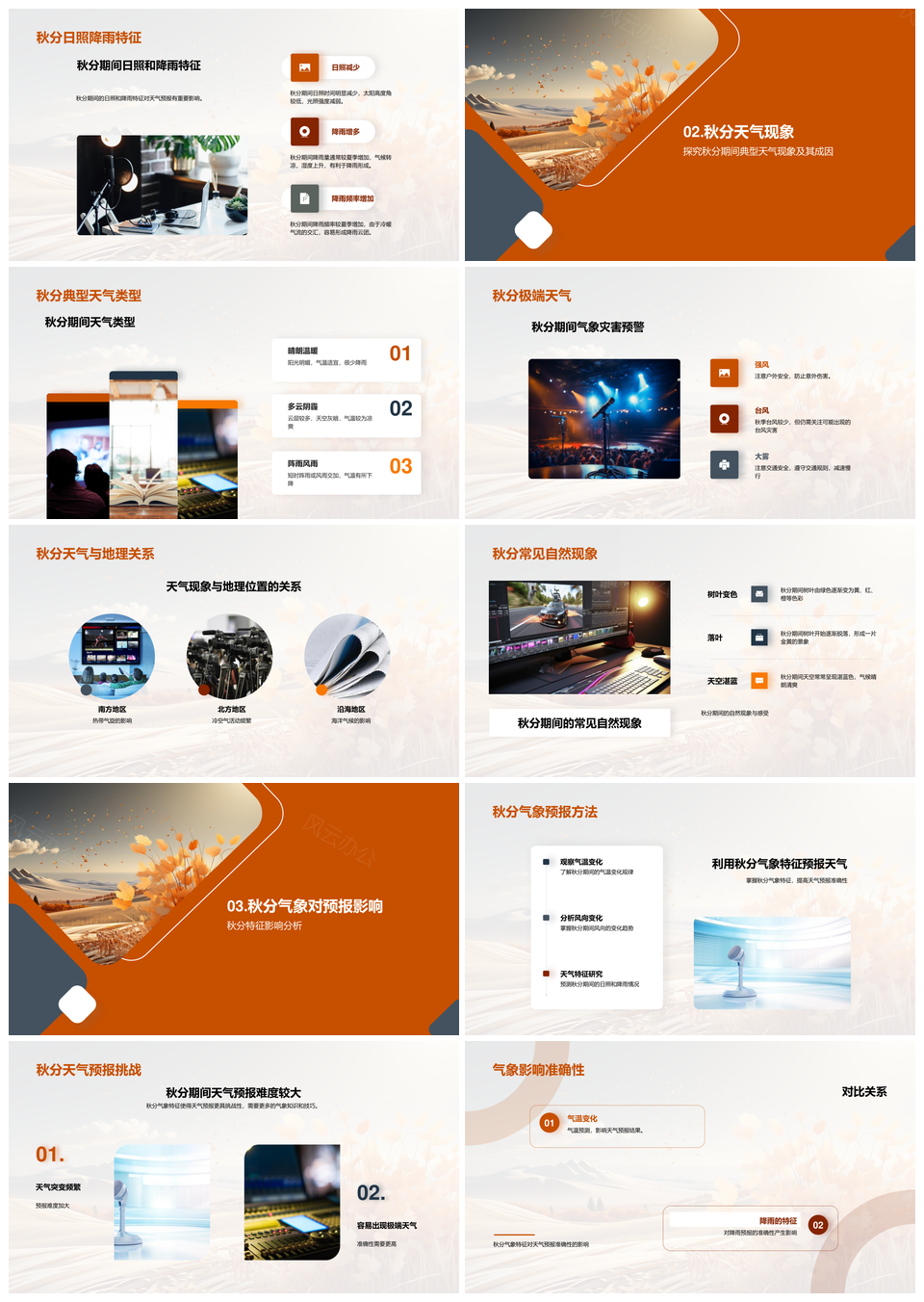 这是一张秋分气温风向日照降雨极端天气地理树叶分析PPT模板,包含秋分、气温、风向、日照、降雨、极端天气、地理、树叶、分析等主题内容,也可用作秋分气温风向日照、气温风向日照降雨、日照降雨极端天气地理、极端天气地理树叶分析、秋分气温日照降雨、气温日照降雨极端天气、日照降雨极端天气地理、降雨极端天气地理树叶、秋分气温日照降雨、极端天气地理树叶分析、秋分风向日照降雨、降雨地理树叶分析、秋分极端天气地理、风向日照极端天气、地理树叶分析等PPT场景使用。 风云办公提供的秋分气温风向日照降雨极端天气地理树叶分析PPT模板,下载格式为pptx,一共26页,作品中文字及图均可以修改和编辑,图片更改请在作品中右键图片并更换,文字修改请直接点击文字进行修改。