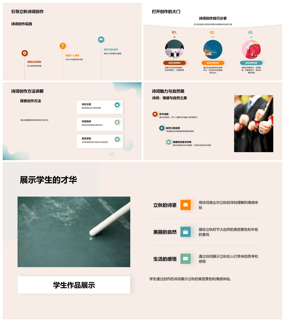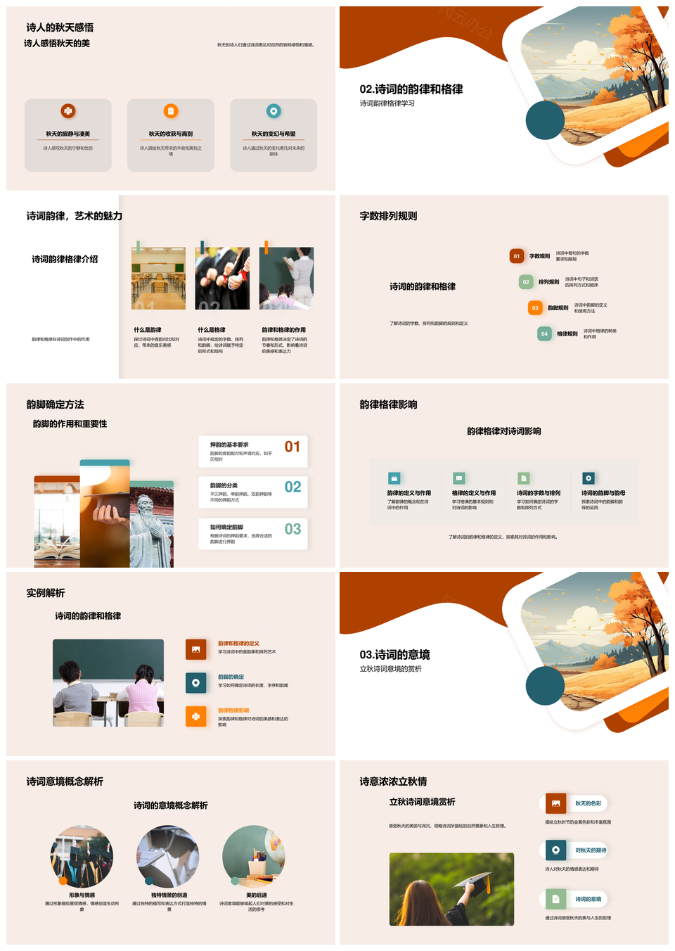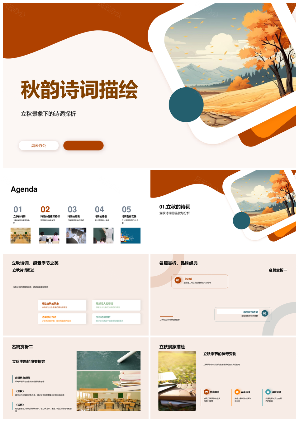 风云办公提供的立秋诗词韵律秋叶意境创作PPT模板,下载格式为pptx,一共33页,作品中文字及图均可以修改和编辑,图片更改请在作品中右键图片并更换,文字修改请直接点击文字进行修改。