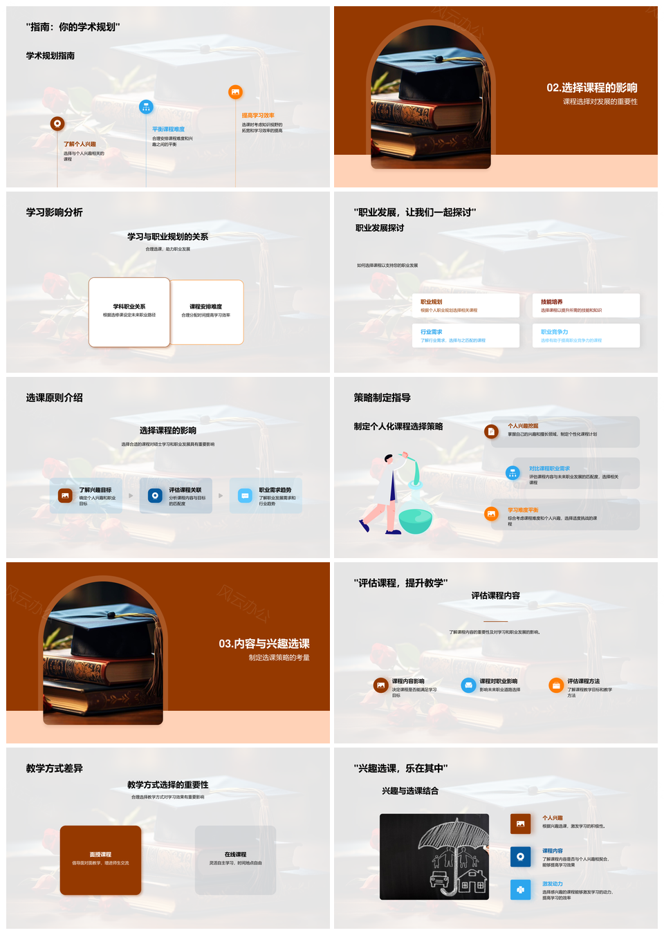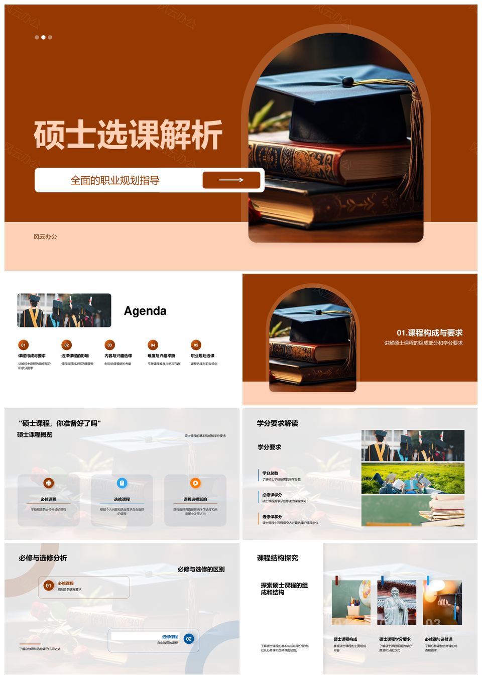 风云办公提供的硕士选课必修选修与职业规划解析PPT模板,下载格式为pptx,一共29页,作品中文字及图均可以修改和编辑,图片更改请在作品中右键图片并更换,文字修改请直接点击文字进行修改。