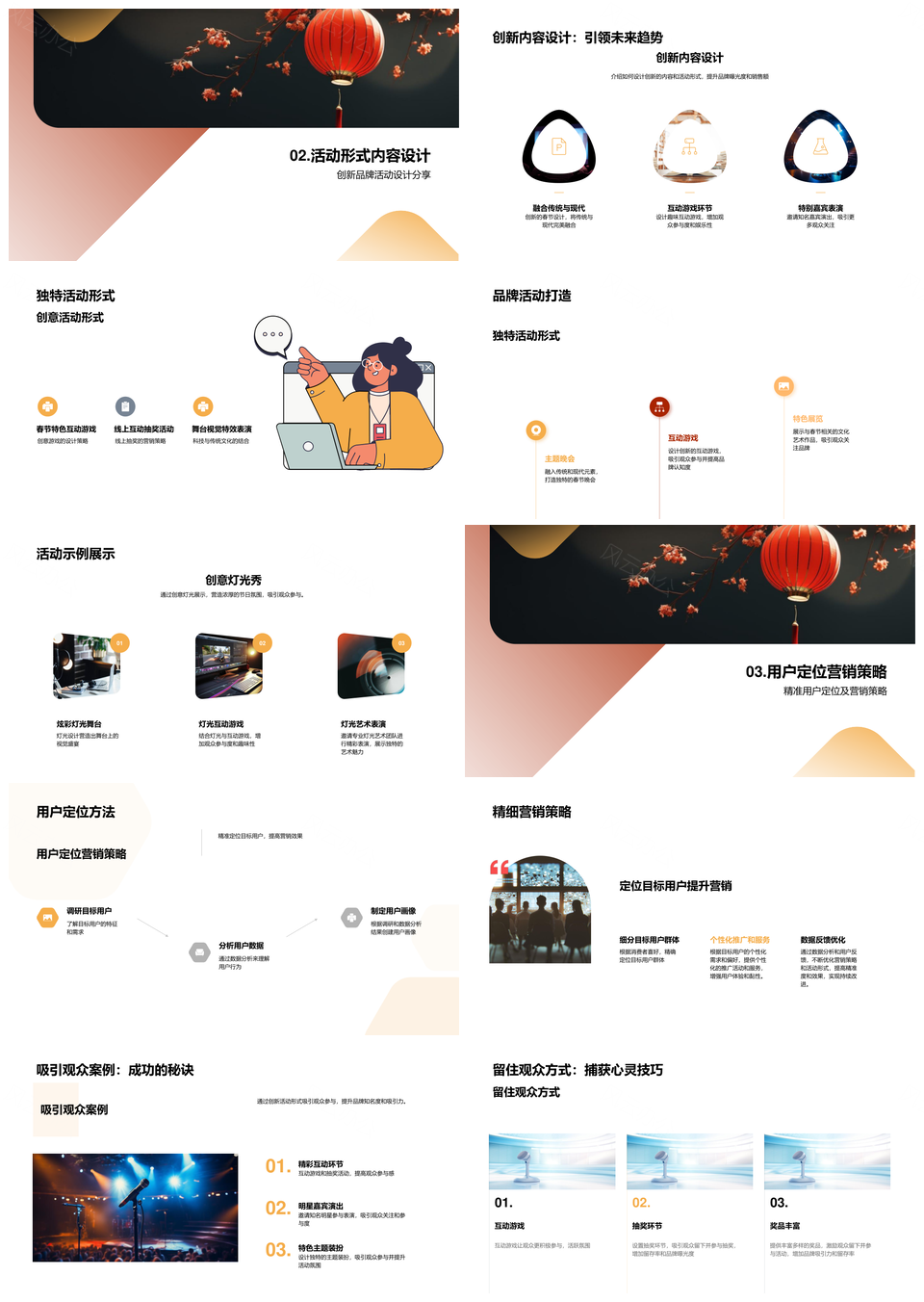 这是一张春节品牌营销用户定位媒体策略创新活动PPT模板,包含春节、品牌、营销、用户、定位、媒体、策略、创新、活动等主题内容,也可用作春节品牌营销用户定位、品牌营销用户定位媒体、用户定位媒体策略创新、媒体策略创新活动、春节品牌营销用户、品牌营销用户定位、用户定位媒体策略、媒体策略创新活动、春节品牌营销、品牌营销用户、用户定位媒体、媒体策略创新、策略创新活动、品牌营销、用户定位、媒体策略等PPT场景使用。 风云办公提供的春节品牌营销用户定位媒体策略创新活动PPT模板,下载格式为pptx,一共28页,作品中文字及图均可以修改和编辑,图片更改请在作品中右键图片并更换,文字修改请直接点击文字进行修改。