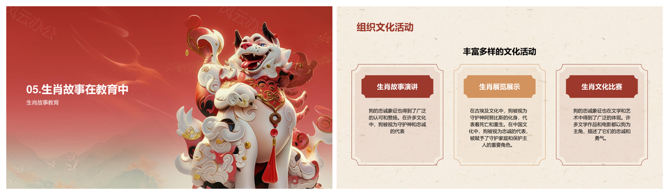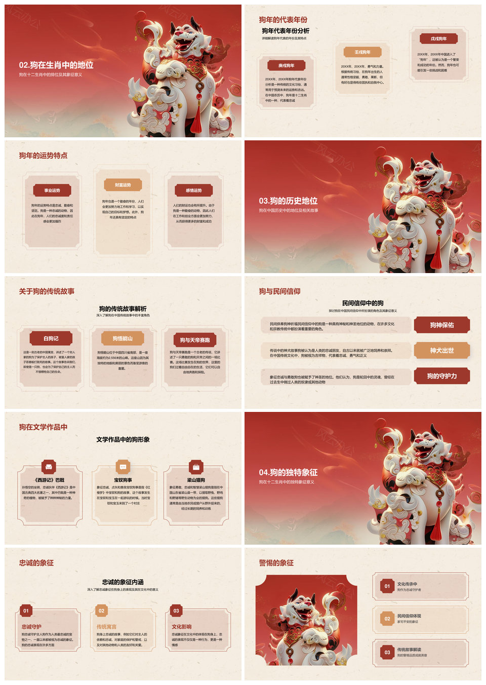 风云办公提供的复古国风红色生肖狗寓言解析PPT模板,下载格式为pptx,一共20页,作品中文字及图均可以修改和编辑,图片更改请在作品中右键图片并更换,文字修改请直接点击文字进行修改。