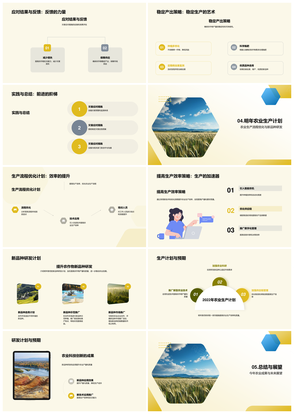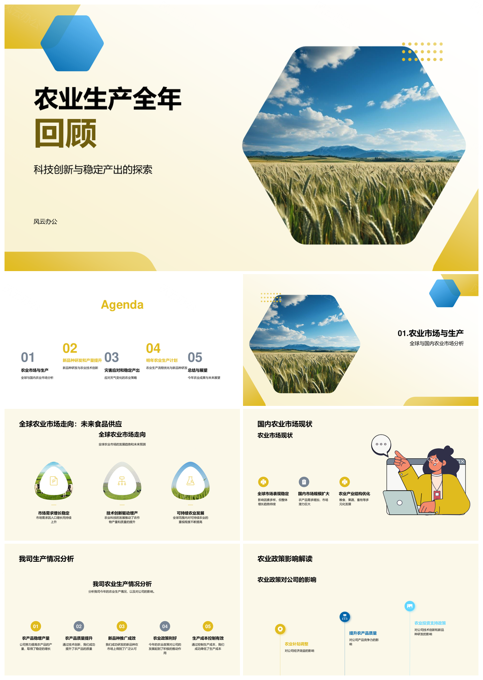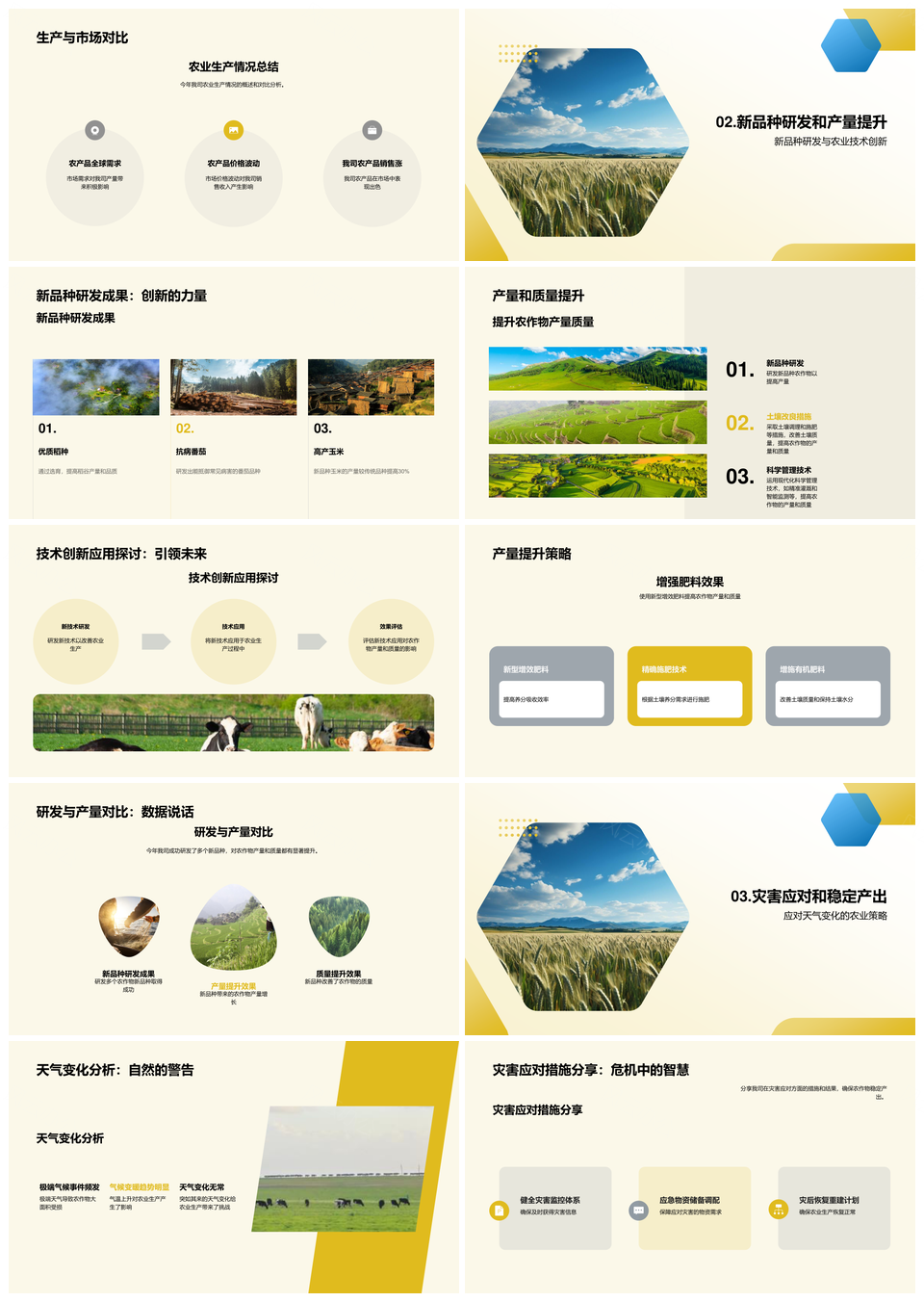 这是一张农业生产全年科技稳产提质新品政策市场天气小麦田PPT模板,包含农业生产、全年、科技、稳产、提质、新品、政策、市场、天气、小麦田等主题内容,也可用作农业生产全年科技稳产、生产全年科技稳产、全年科技稳产提质、科技稳产提质新品、稳产提质新品政策、提质新品政策市场、新品政策市场天气、政策市场天气小麦、农业生产全年、生产全年科技、全年科技稳产、科技稳产提质、稳产提质新品、提质新品政策、新品政策市场等PPT场景使用。 风云办公提供的农业生产全年科技稳产提质新品政策市场天气小麦田PPT模板,下载格式为pptx,一共33页,作品中文字及图均可以修改和编辑,图片更改请在作品中右键图片并更换,文字修改请直接点击文字进行修改。