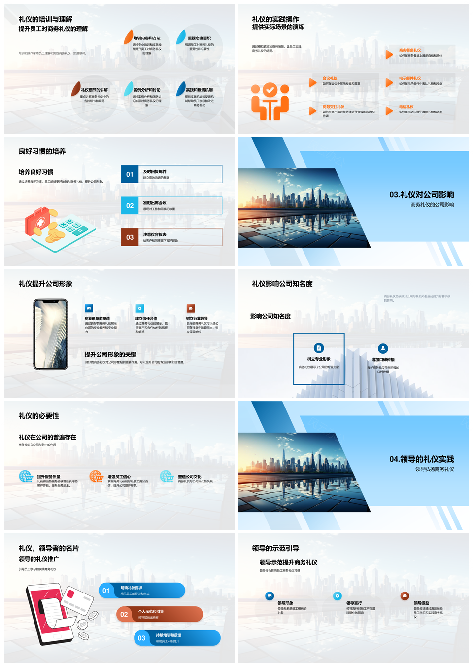 风云办公提供的企业商务礼仪培训提升形象与公司文化PPT模板,下载格式为pptx,一共23页,作品中文字及图均可以修改和编辑,图片更改请在作品中右键图片并更换,文字修改请直接点击文字进行修改。