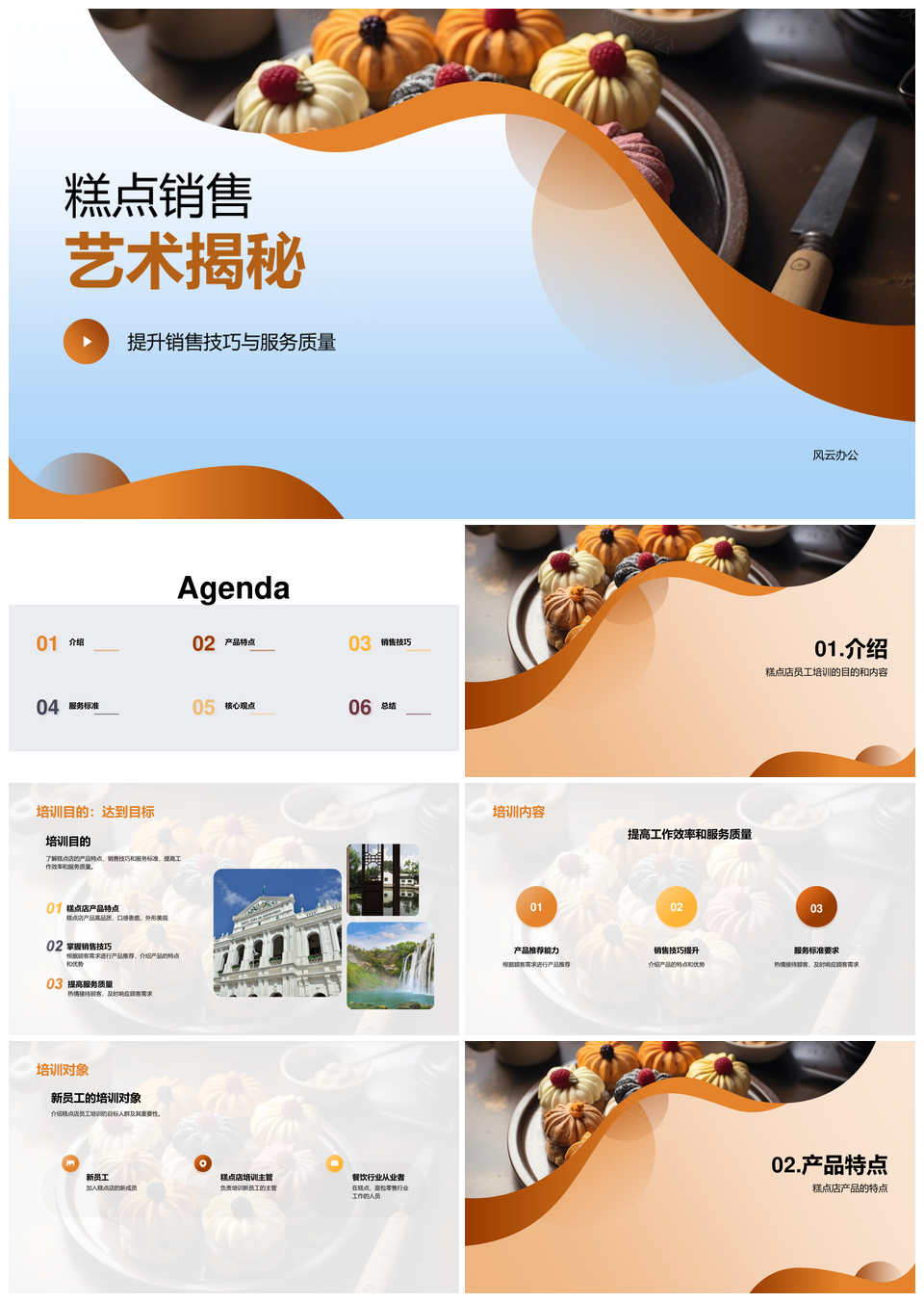 风云办公提供的糕点店新员工产品知识销售技巧培训PPT模板,下载格式为pptx,一共27页,作品中文字及图均可以修改和编辑,图片更改请在作品中右键图片并更换,文字修改请直接点击文字进行修改。