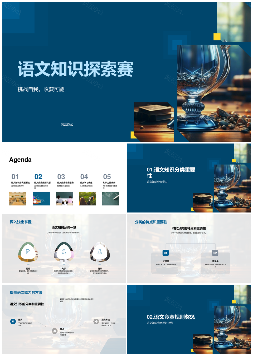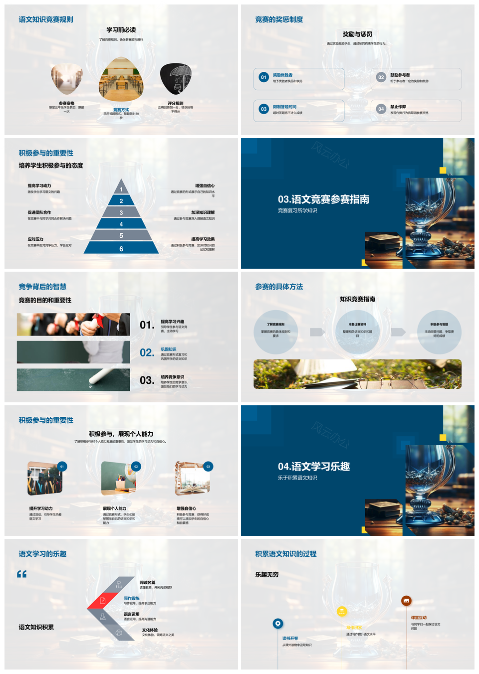 风云办公提供的三年级师生语文知识竞赛课件奖杯竞逐PPT模板,下载格式为pptx,一共23页,作品中文字及图均可以修改和编辑,图片更改请在作品中右键图片并更换,文字修改请直接点击文字进行修改。