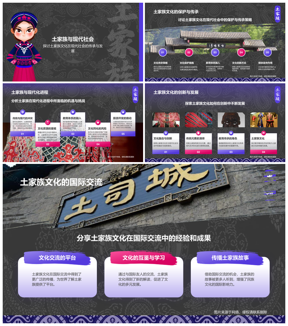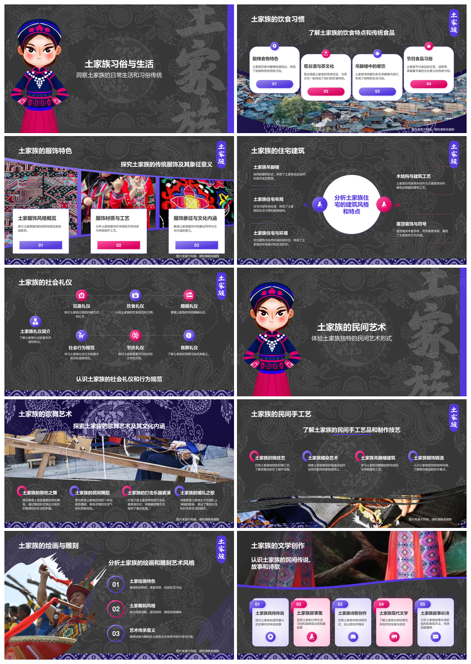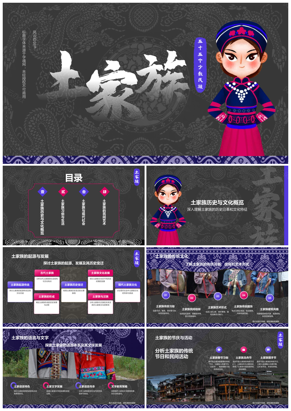 这是一张土家族历史语言文化传统渊源分布人口概况PPT模板,包含土家族、历史、语言、文化、传统、渊源、分布、人口、概况等主题内容,也可用作土家族历史语言文化、历史语言文化传统、语言文化传统渊源、文化传统渊源分布、传统渊源分布人口、渊源分布人口概况、土家族历史语言、土家族文化传统、土家族分布人口、历史语言文化、语言文化传统、文化传统渊源、传统渊源分布、渊源分布人口、分布人口概况等PPT场景使用。 风云办公提供的土家族历史语言文化传统渊源分布人口概况PPT模板,下载格式为pptx,一共23页,作品中文字及图均可以修改和编辑,图片更改请在作品中右键图片并更换,文字修改请直接点击文字进行修改。