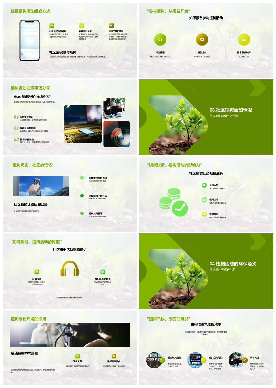 风云办公提供的共筑绿色家园社区植树全民行动PPT模板,下载格式为pptx,一共23页,作品中文字及图均可以修改和编辑,图片更改请在作品中右键图片并更换,文字修改请直接点击文字进行修改。