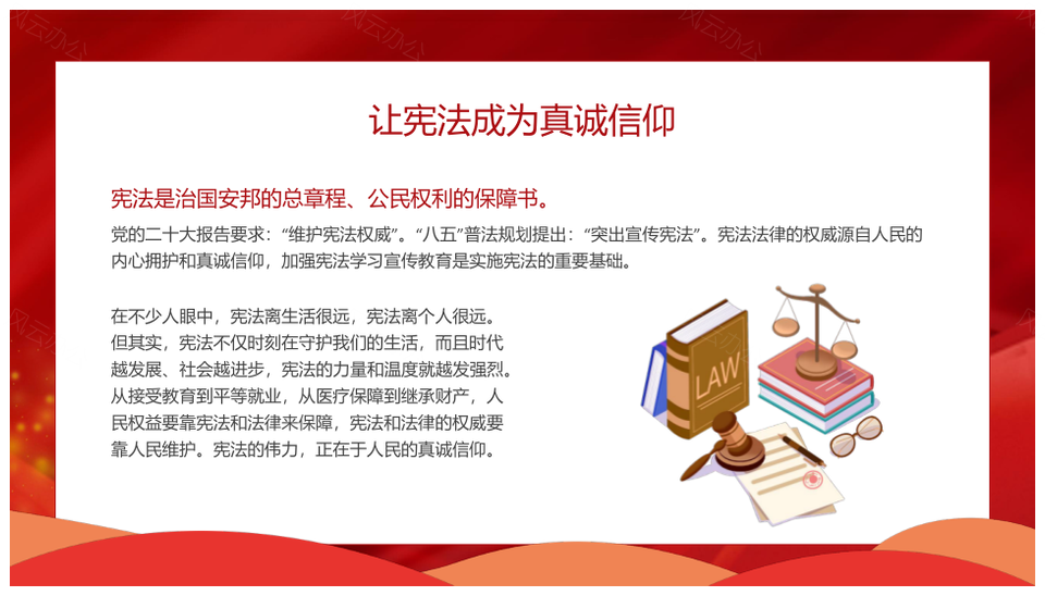 这是一张国家宪法日红色卡通法治学宪法主题班会PPT模板,包含国家、宪法日、红色、卡通、法治、学宪法、主题班会等主题内容,也可用作国家宪法日红色卡通法治、国家宪法红色卡通法治、宪法日红色卡通法治、国家红色卡通法治、宪法红色卡通法治、国家宪法日红色卡通、宪法日红色卡通主题、国家宪法红色卡通、红色卡通法治学、法治学宪法主题班会、学宪法主题班会、红色法治学宪法、国家宪法日法治、国家法治学宪法、宪法日法治学等PPT场景使用。 风云办公提供的国家宪法日红色卡通法治学宪法主题班会PPT模板,下载格式为pptx,一共29页,作品中文字及图均可以修改和编辑,图片更改请在作品中右键图片并更换,文字修改请直接点击文字进行修改。