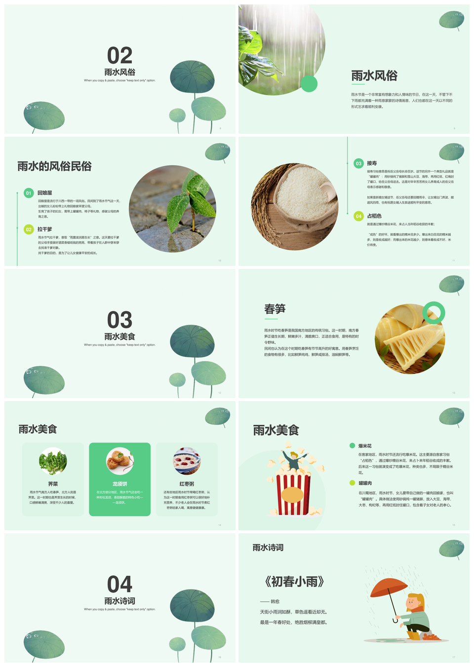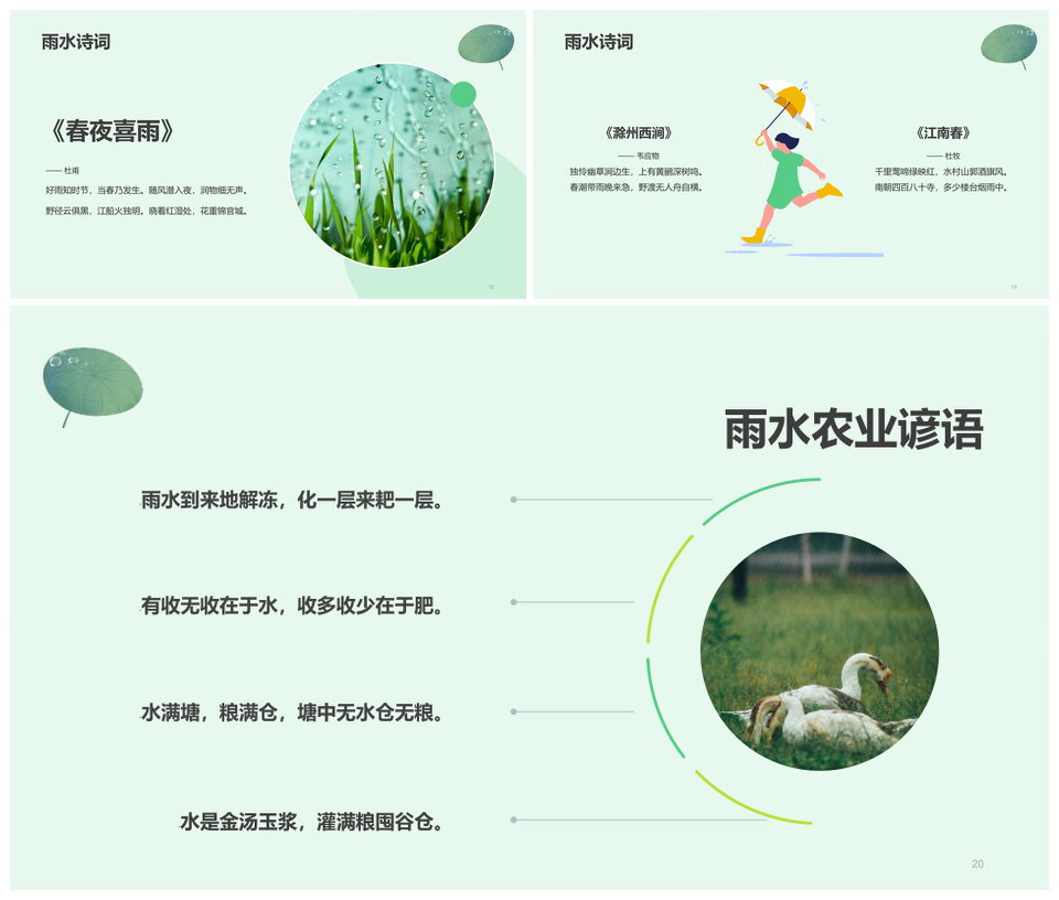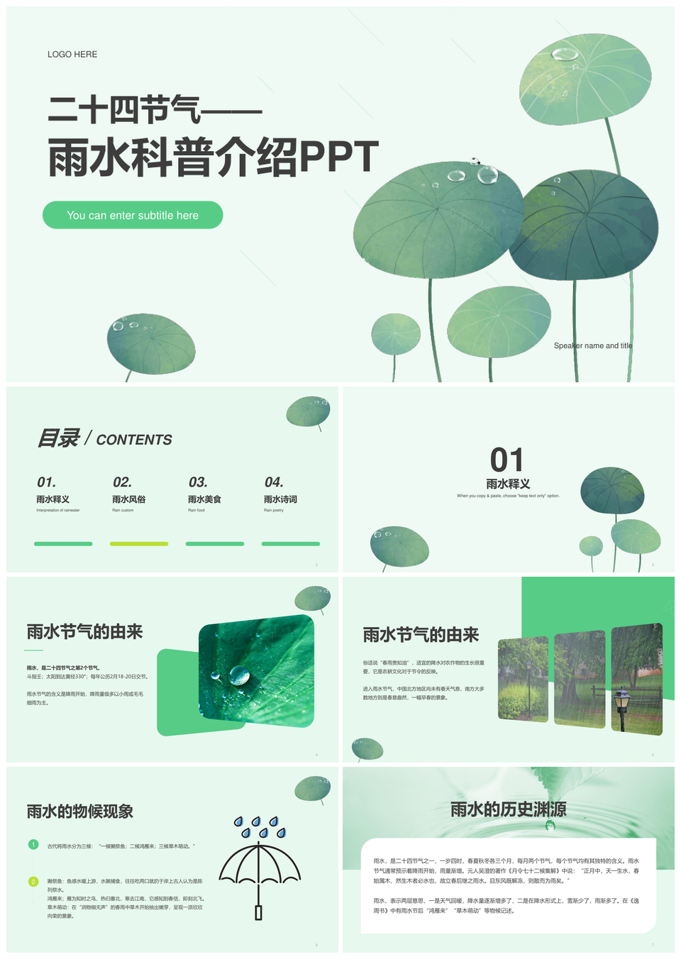 风云办公提供的绿色水墨插画雨水节气荷叶中国风科普PPT模板,下载格式为pptx,一共21页,作品中文字及图均可以修改和编辑,图片更改请在作品中右键图片并更换,文字修改请直接点击文字进行修改。