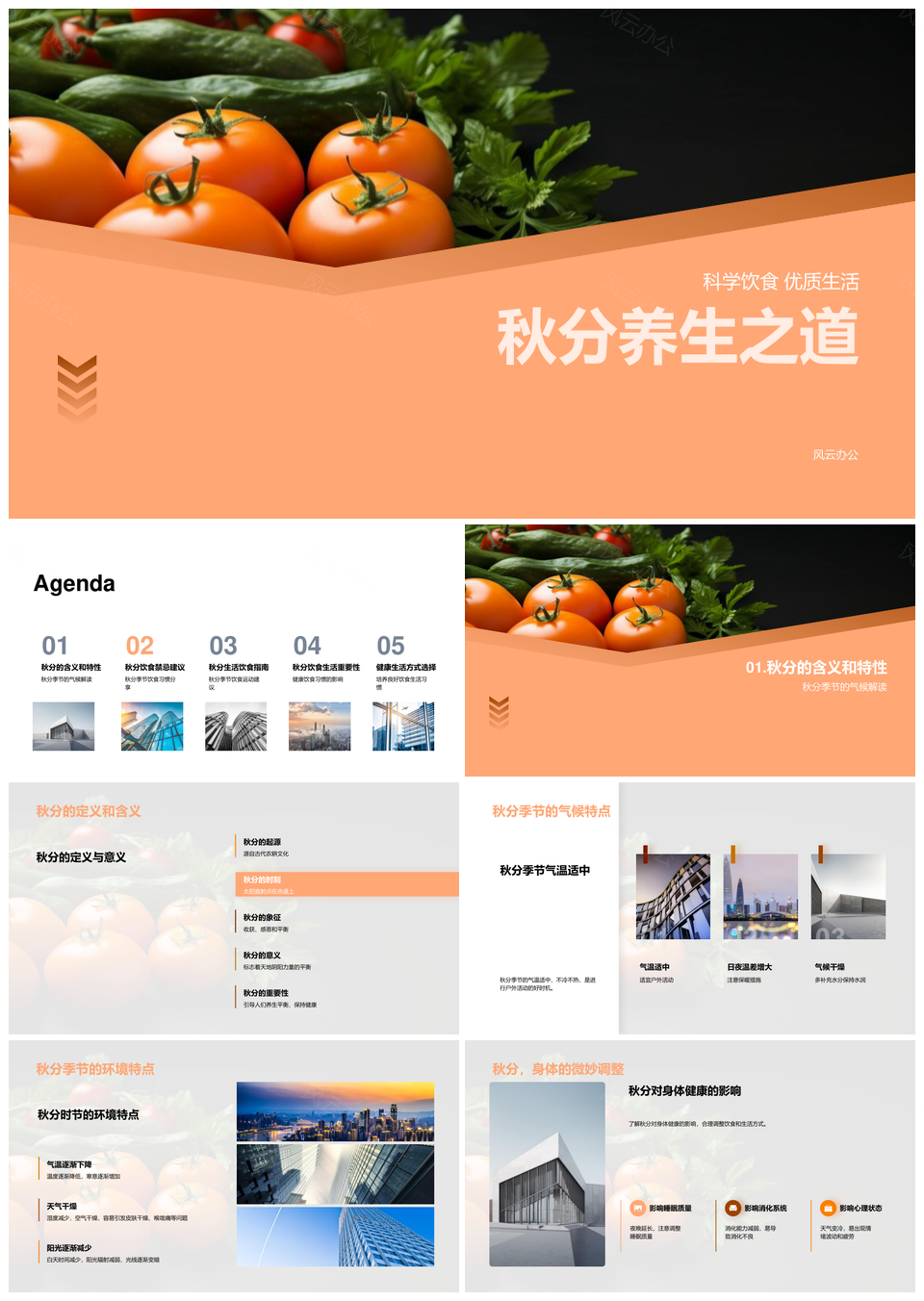 风云办公提供的秋分节气科学饮食养生优质生活落叶PPT模板,下载格式为pptx,一共33页,作品中文字及图均可以修改和编辑,图片更改请在作品中右键图片并更换,文字修改请直接点击文字进行修改。