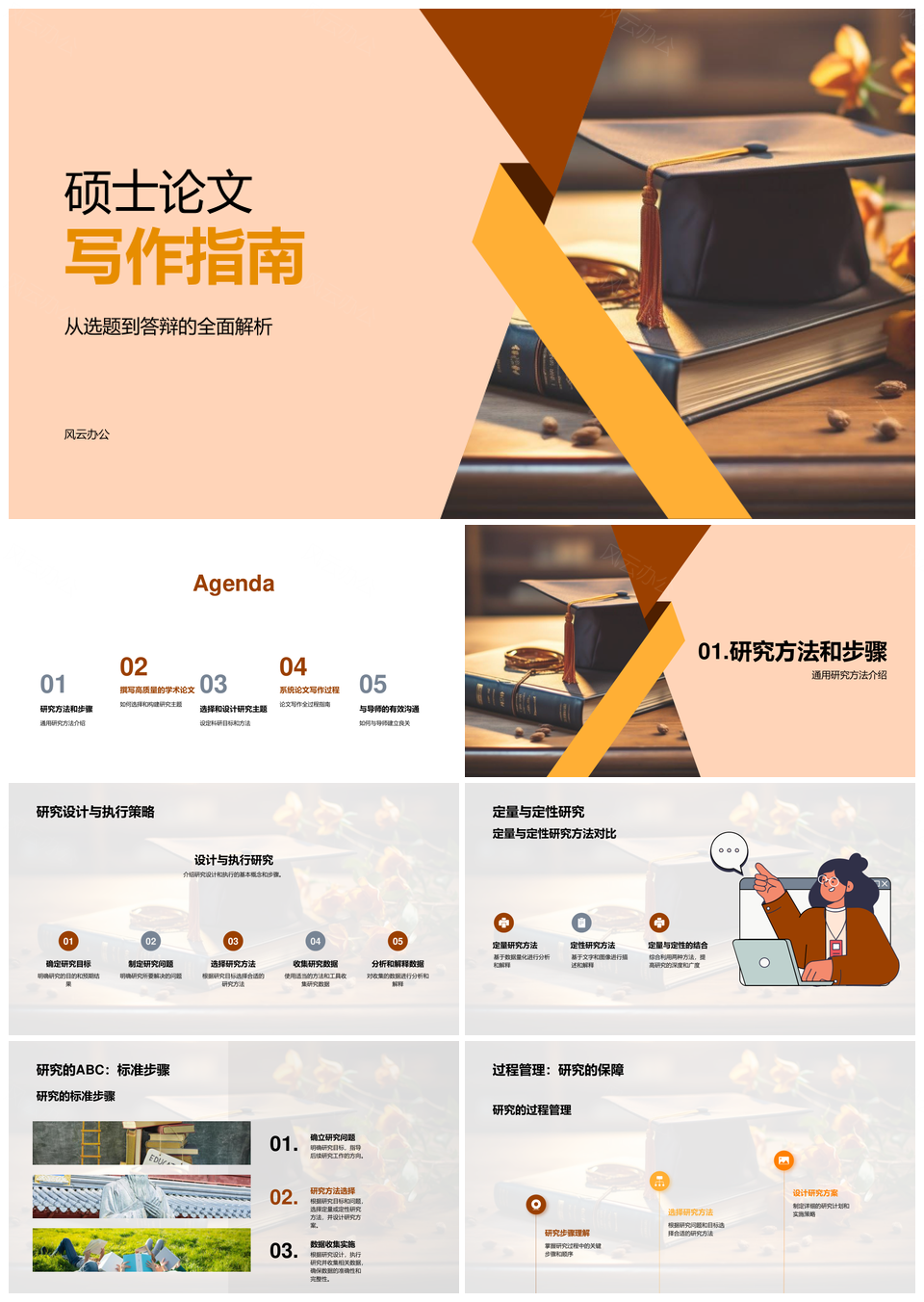 风云办公提供的硕士论文研究方法设计与答辩指南PPT模板,下载格式为pptx,一共28页,作品中文字及图均可以修改和编辑,图片更改请在作品中右键图片并更换,文字修改请直接点击文字进行修改。