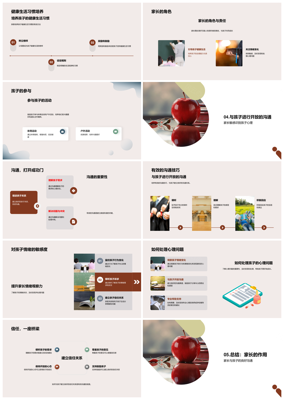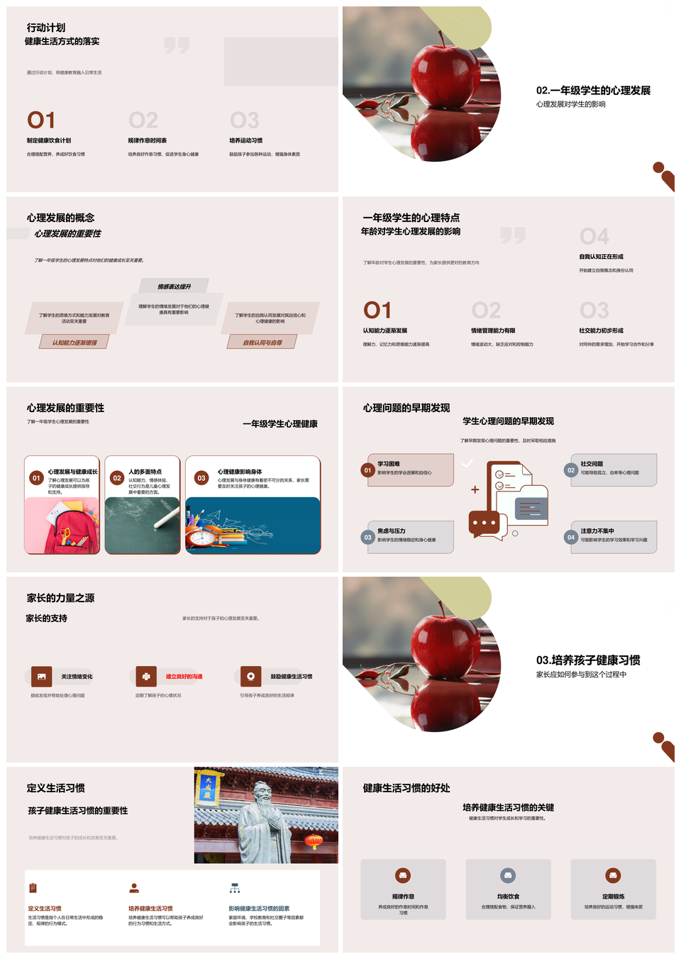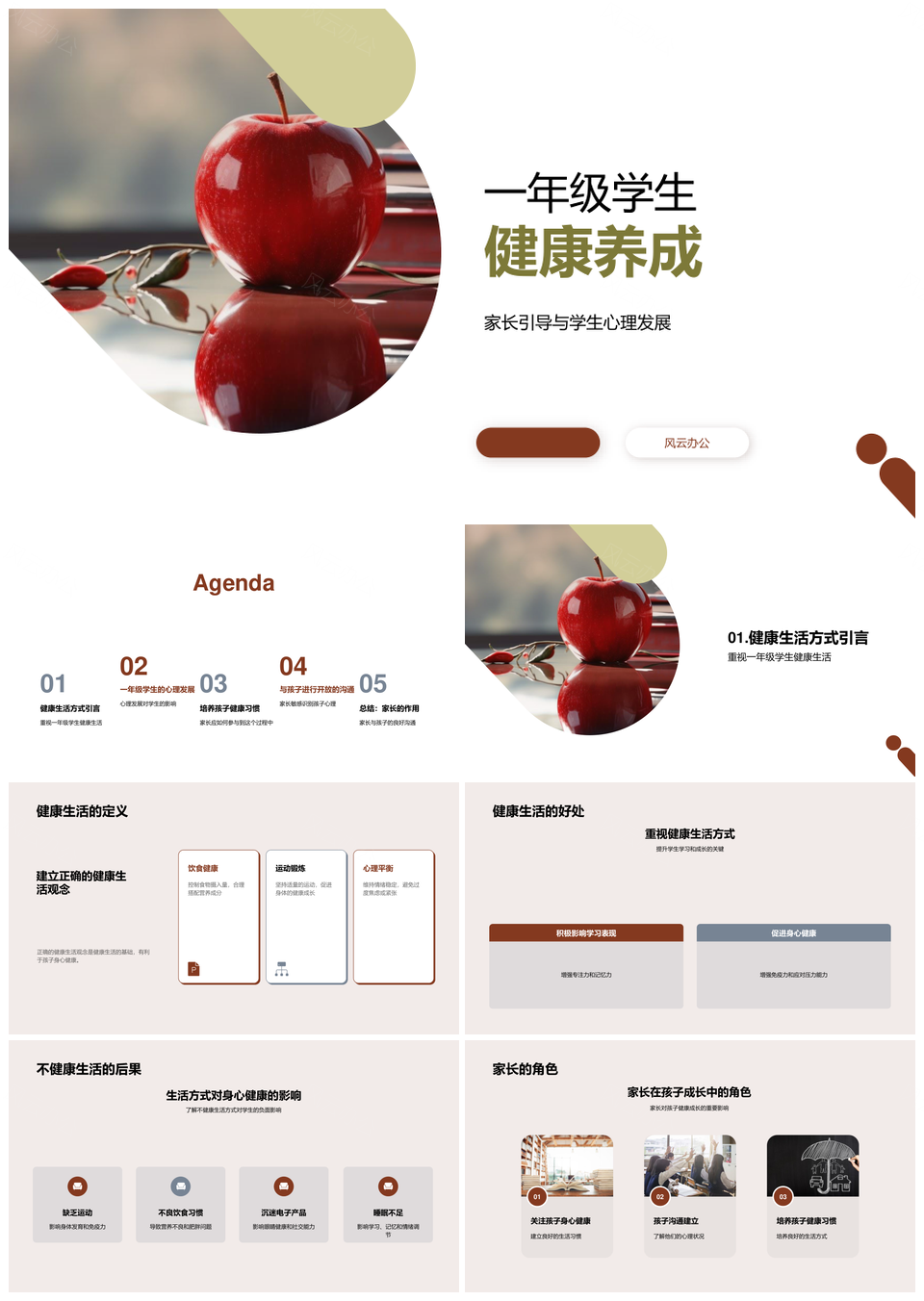 这是一张一年级学生健康习惯家长引导心理成长沟通苹果PPT模板,包含一年级学生、健康习惯、家长引导、心理成长、沟通、苹果等主题内容,也可用作一年级学生健康习惯家长、学生健康习惯家长引导、健康习惯家长引导心理成长、家长引导心理成长沟通、引导心理成长沟通苹果、一年级学生健康习惯、学生健康习惯家长、健康习惯家长引导、家长引导心理成长、引导心理成长沟通、心理成长沟通苹果、一年级学生、学生健康习惯、健康习惯家长、家长引导等PPT场景使用。 风云办公提供的一年级学生健康习惯家长引导心理成长沟通苹果PPT模板,下载格式为pptx,一共33页,作品中文字及图均可以修改和编辑,图片更改请在作品中右键图片并更换,文字修改请直接点击文字进行修改。