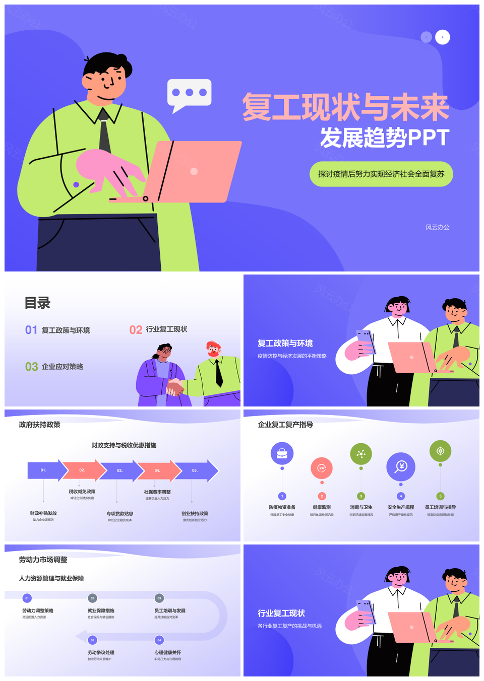 风云办公提供的企业复工产业恢复工作推进概述PPT模板,下载格式为pptx,一共17页,作品中文字及图均可以修改和编辑,图片更改请在作品中右键图片并更换,文字修改请直接点击文字进行修改。