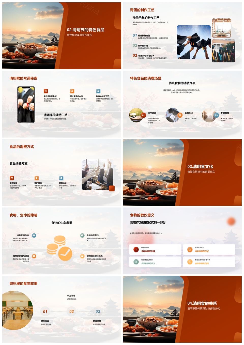 风云办公提供的清明食俗祭祀与传统制作技艺PPT模板,下载格式为pptx,一共26页,作品中文字及图均可以修改和编辑,图片更改请在作品中右键图片并更换,文字修改请直接点击文字进行修改。