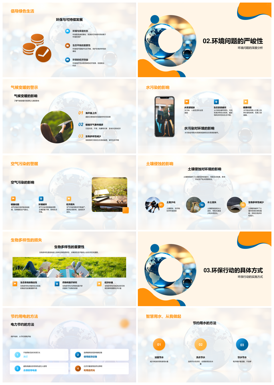 这是一张环保生活守护地球应对气候水土生物多样性PPT模板,包含环保生活、守护地球、应对、气候、水土、生物多样性等主题内容,也可用作环保生活守护地球、守护地球应对气候、应对气候水土生物多样性、环保生活守护应对、环保地球应对气候、生活守护地球应对、地球应对气候水土、应对气候水土生物、气候水土生物多样性、环保生活地球应对、生活守护应对气候、守护地球气候水土、应对水土生物多样性、环保应对气候水土、生活地球应对气候等PPT场景使用。 风云办公提供的环保生活守护地球应对气候水土生物多样性PPT模板,下载格式为pptx,一共33页,作品中文字及图均可以修改和编辑,图片更改请在作品中右键图片并更换,文字修改请直接点击文字进行修改。
