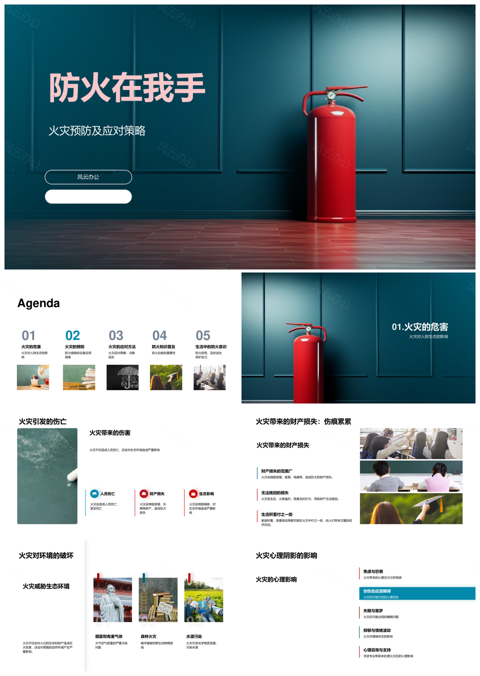风云办公提供的防火安全措施与逃生技巧灭火器PPT模板,下载格式为pptx,一共29页,作品中文字及图均可以修改和编辑,图片更改请在作品中右键图片并更换,文字修改请直接点击文字进行修改。