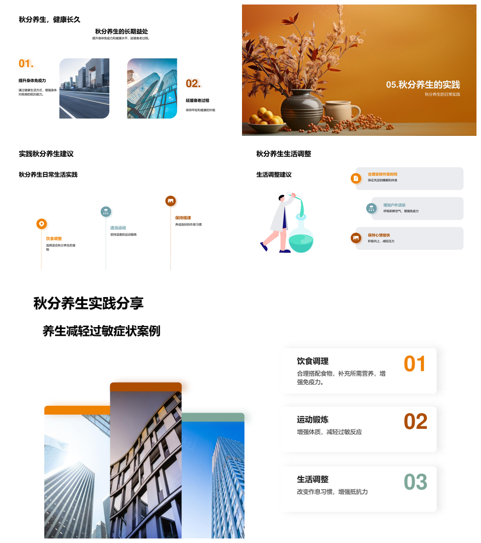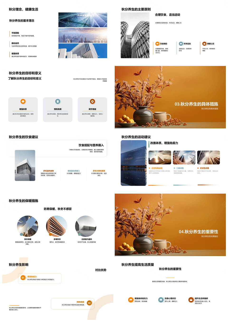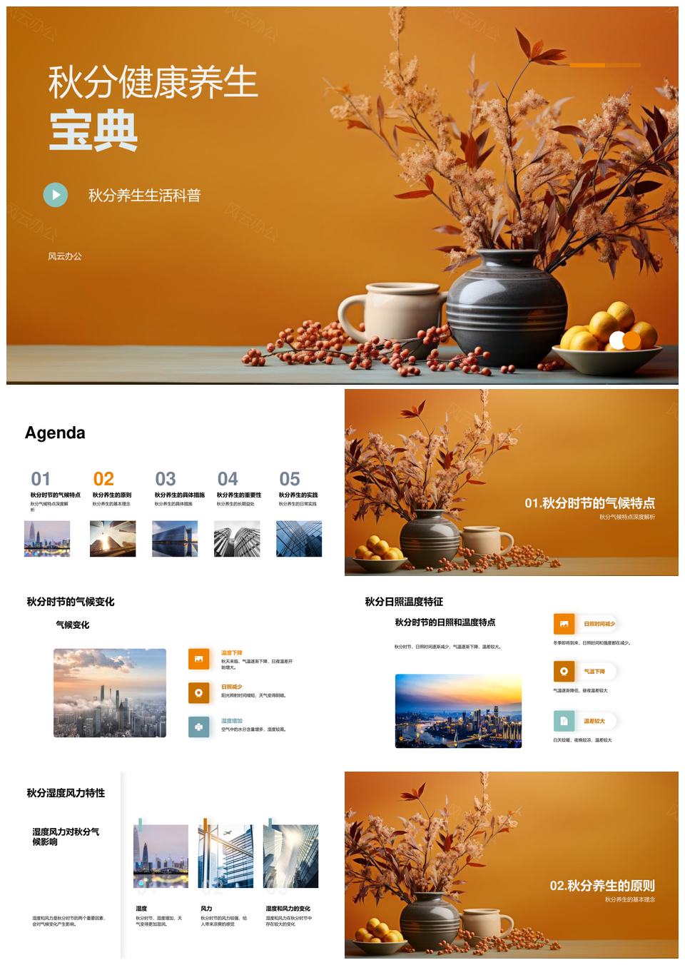 风云办公提供的秋分养生生活科普与秋叶宝典PPT模板,下载格式为pptx,一共23页,作品中文字及图均可以修改和编辑,图片更改请在作品中右键图片并更换,文字修改请直接点击文字进行修改。