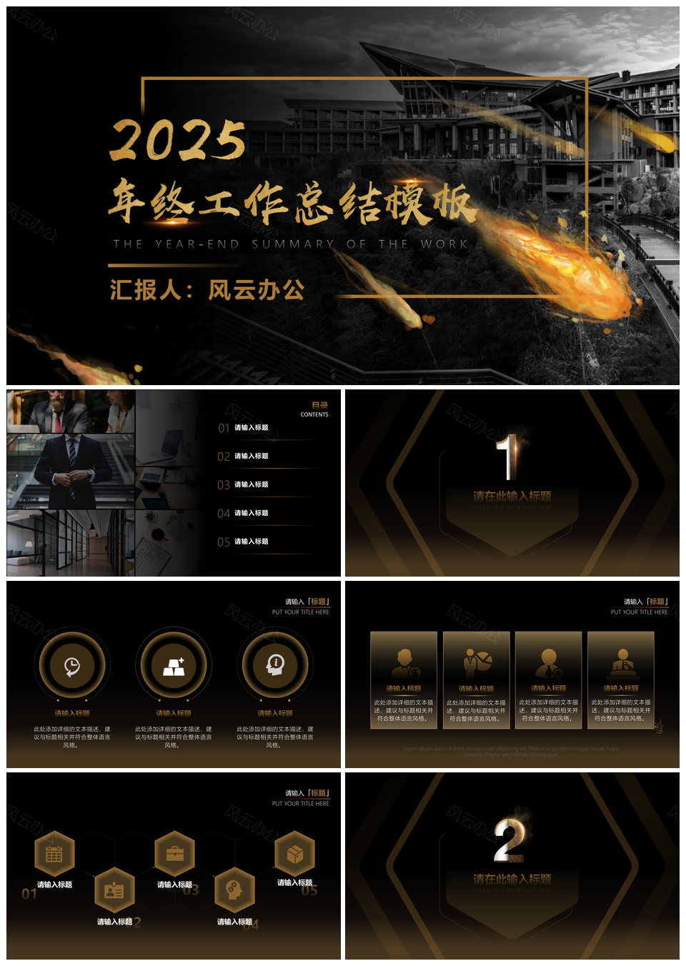 风云办公提供的2025彩色黑金高端年会述职PPT模板,下载格式为pptx,一共24页,作品中文字及图均可以修改和编辑,图片更改请在作品中右键图片并更换,文字修改请直接点击文字进行修改。