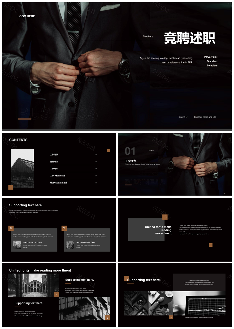 风云办公提供的黑色商务西装领带竞聘简历PPT模板,下载格式为pptx,一共15页,作品中文字及图均可以修改和编辑,图片更改请在作品中右键图片并更换,文字修改请直接点击文字进行修改。