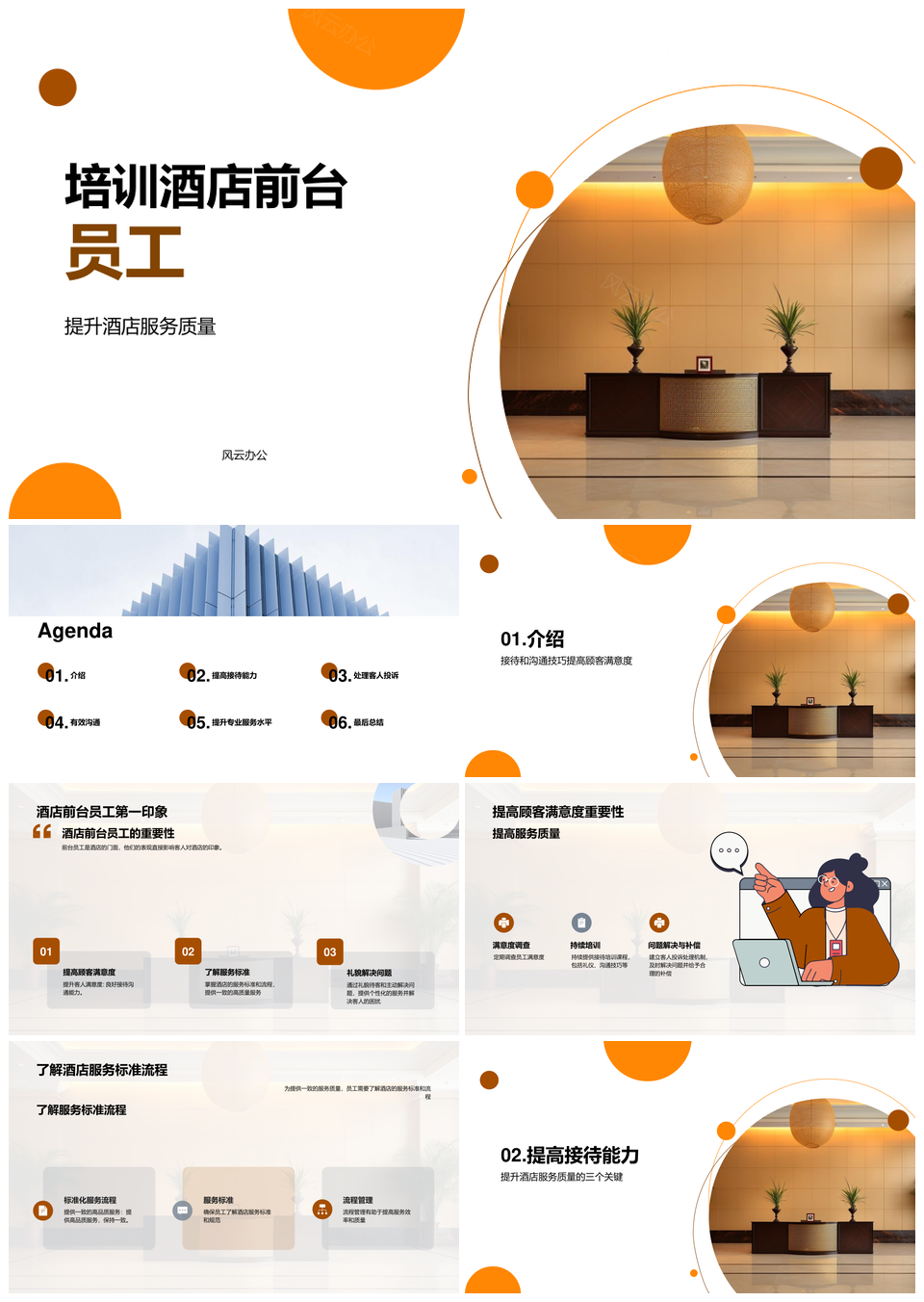 这是一张酒店前台员工培训提升服务接待沟通技巧PPT模板,包含酒店前台、员工、培训、提升、服务、接待、沟通、技巧等主题内容,也可用作酒店前台员工培训提升、酒店前台员工培训服务、酒店前台员工提升服务、前台员工培训提升服务、员工培训提升服务接待、培训提升服务接待沟通、提升服务接待沟通技巧、酒店前台培训服务接待、酒店员工培训沟通技巧、前台培训服务接待沟通、员工提升服务接待沟通、服务接待沟通技巧提升、酒店前台员工沟通技巧、培训提升沟通技巧、酒店服务接待沟通等PPT场景使用。 风云办公提供的酒店前台员工培训提升服务接待沟通技巧PPT模板,下载格式为pptx,一共26页,作品中文字及图均可以修改和编辑,图片更改请在作品中右键图片并更换,文字修改请直接点击文字进行修改。