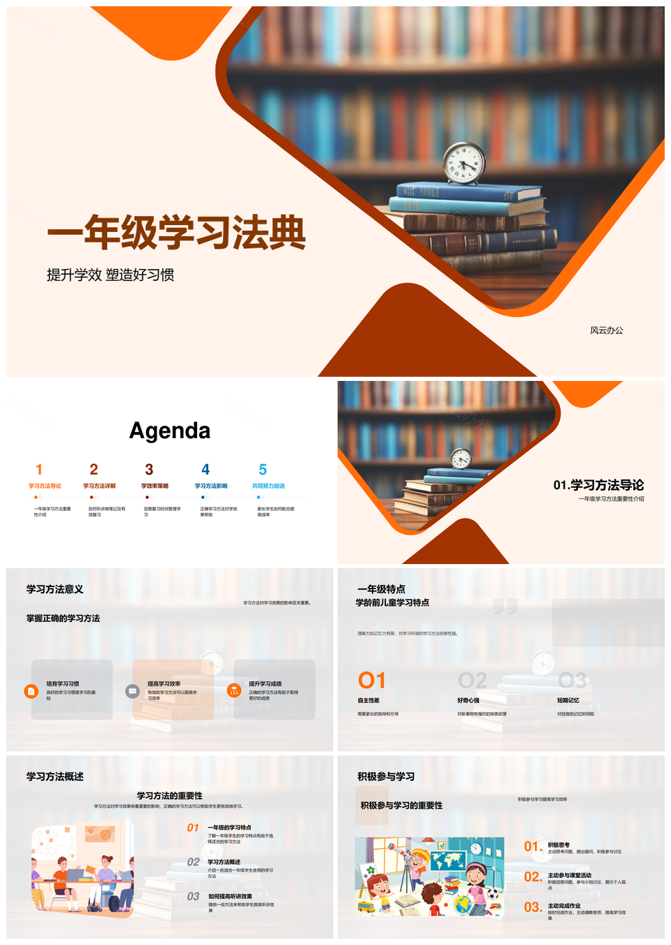 这是一张一年级学习法提效习惯专注笔记复习时间书单PPT模板,包含学习法、提效、习惯、专注、笔记、复习、时间、书单等主题内容,也可用作一年级学习法提效习惯、学习法提效习惯专注、提效习惯专注笔记、习惯专注笔记复习、专注笔记复习时间、笔记复习时间书单、一年级学习法提效、学习法提效习惯、提效习惯专注、习惯专注笔记、专注笔记复习、笔记复习时间、复习时间书单、一年级学习法、学习法提效等PPT场景使用。 风云办公提供的一年级学习法提效习惯专注笔记复习时间书单PPT模板,下载格式为pptx,一共33页,作品中文字及图均可以修改和编辑,图片更改请在作品中右键图片并更换,文字修改请直接点击文字进行修改。