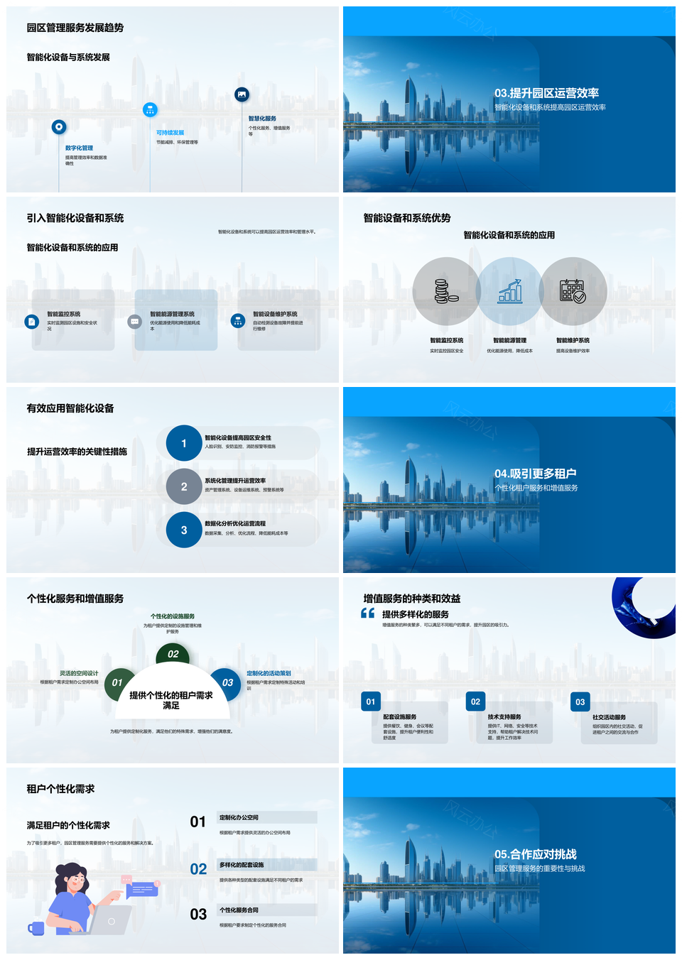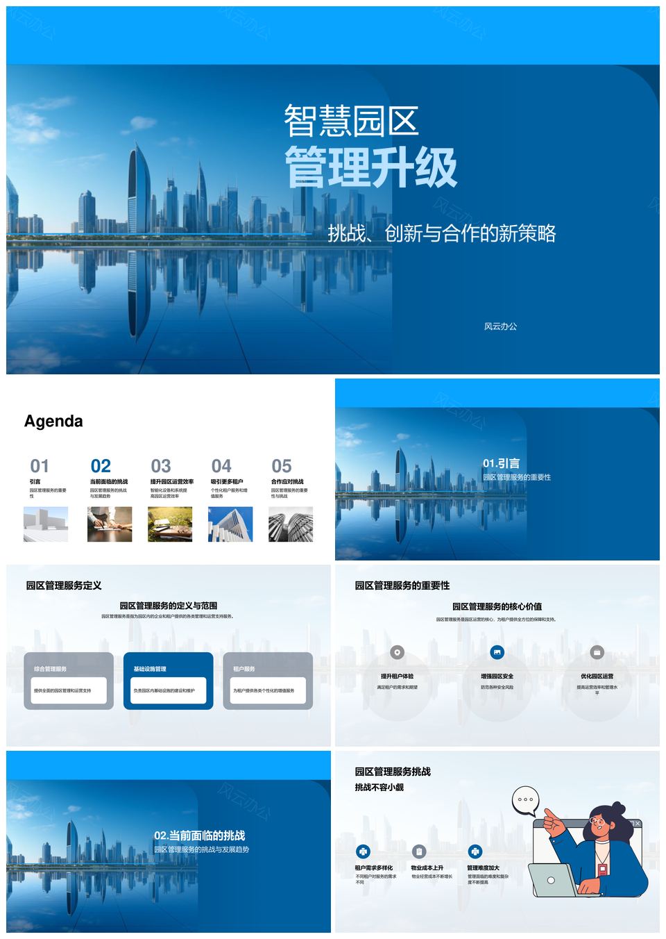 风云办公提供的智慧园区管理升级挑战机遇与智能城市PPT模板,下载格式为pptx,一共21页,作品中文字及图均可以修改和编辑,图片更改请在作品中右键图片并更换,文字修改请直接点击文字进行修改。