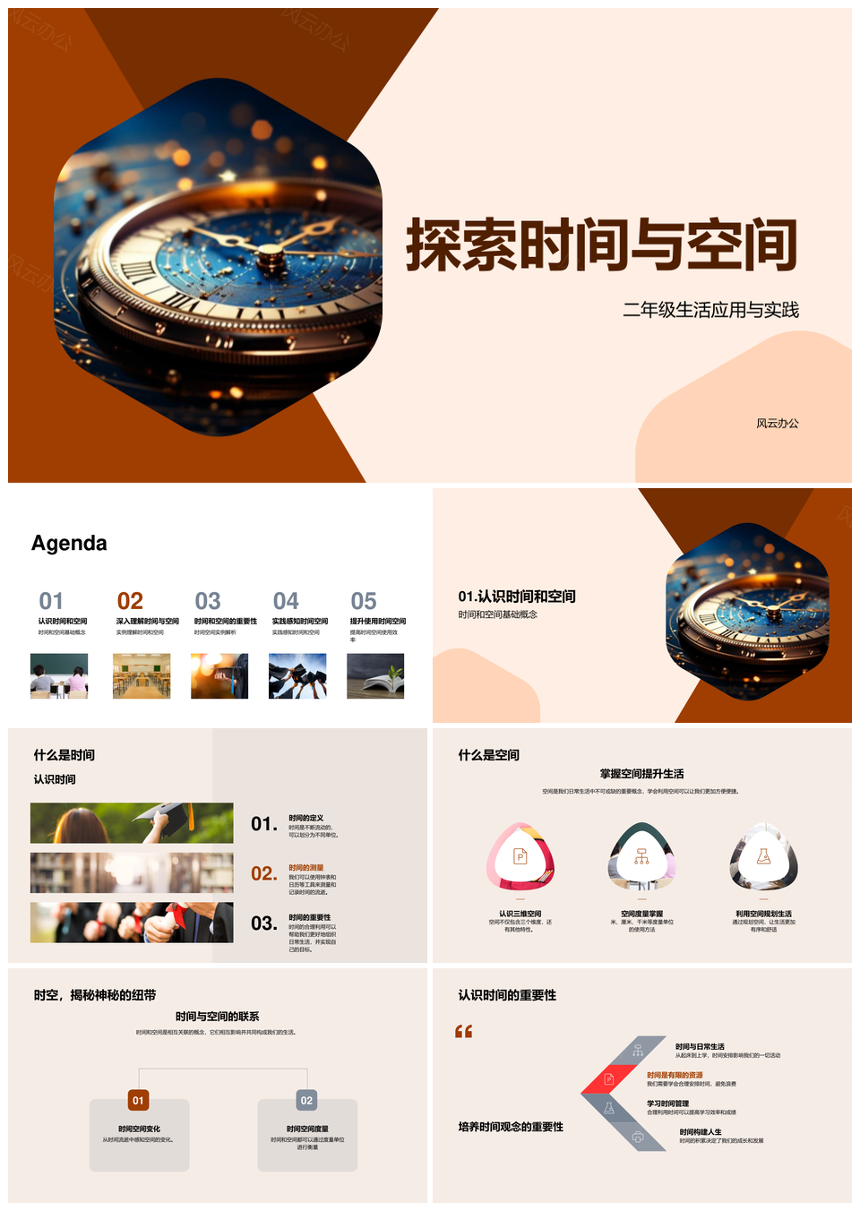风云办公提供的二年级生活实践感知时空时钟教育应用PPT模板,下载格式为pptx,一共33页,作品中文字及图均可以修改和编辑,图片更改请在作品中右键图片并更换,文字修改请直接点击文字进行修改。