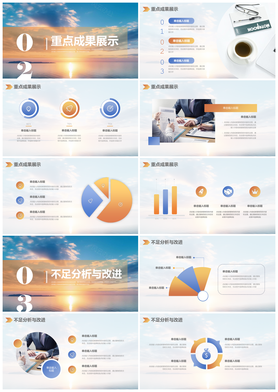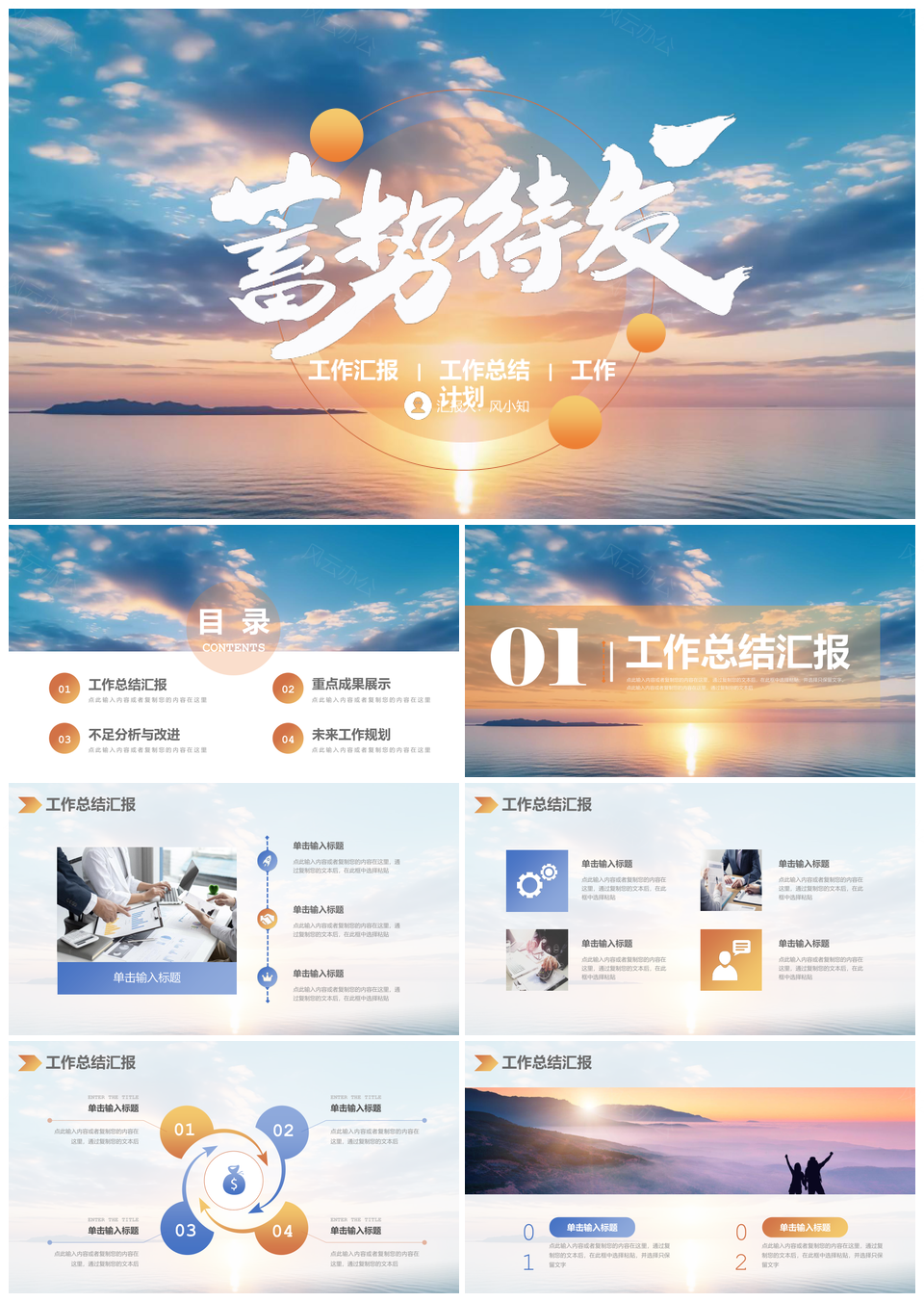 风云办公提供的蓝橙渐变日出励志风季度工作总结汇报PPT模板,下载格式为pptx,一共24页,作品中文字及图均可以修改和编辑,图片更改请在作品中右键图片并更换,文字修改请直接点击文字进行修改。