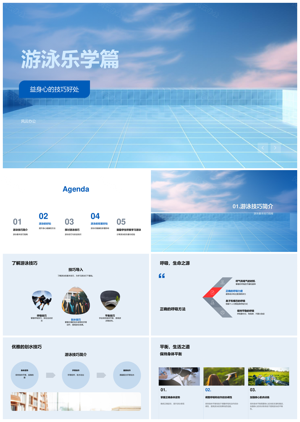 风云办公提供的游泳乐学技巧强身益心肺健体PPT模板,下载格式为pptx,一共28页,作品中文字及图均可以修改和编辑,图片更改请在作品中右键图片并更换,文字修改请直接点击文字进行修改。