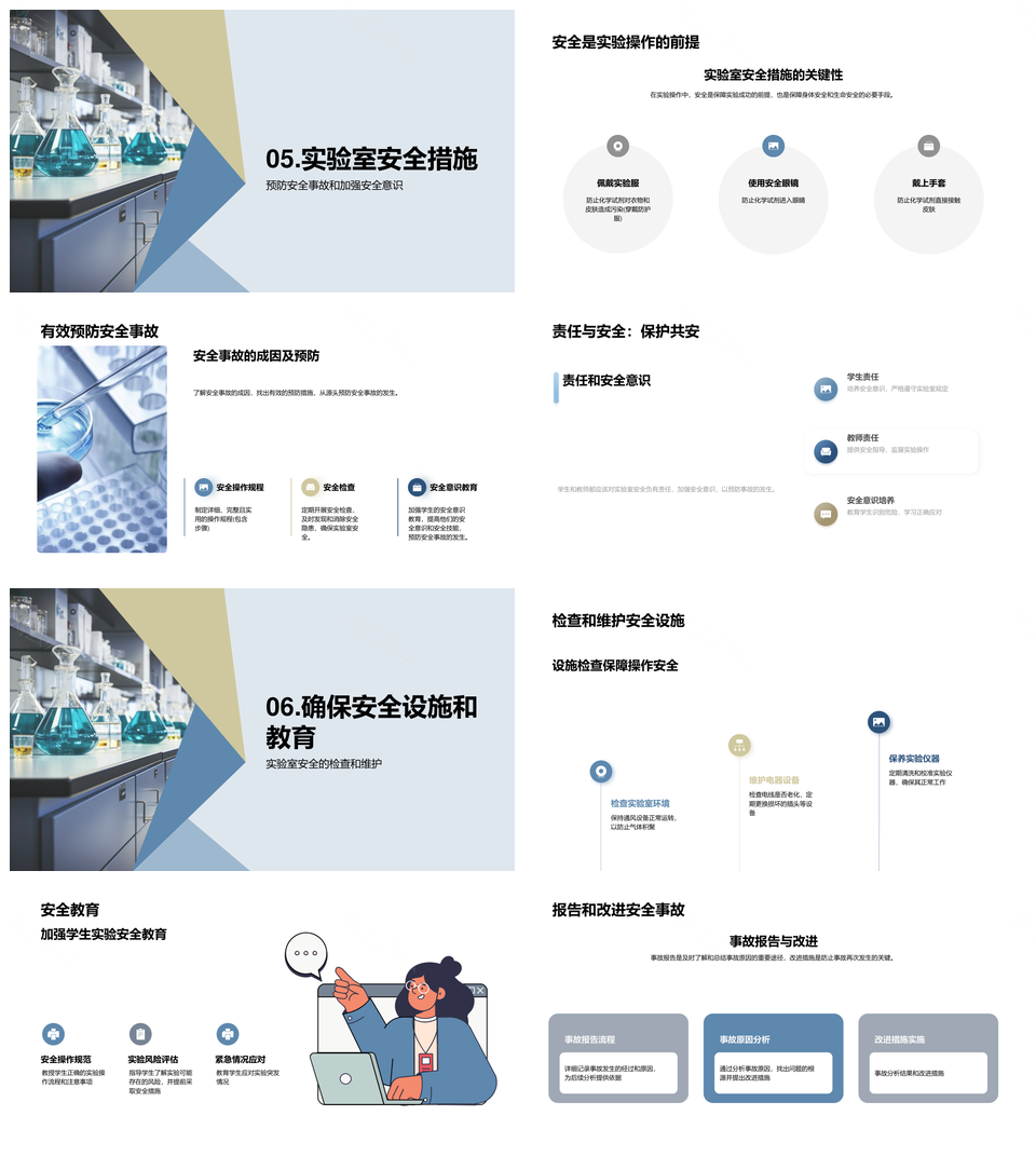 这是一张化学实验室安全教师指导设备操作防事故PPT模板,包含化学实验室、安全教师、指导、设备、操作、防事故等主题内容,也可用作化学实验室安全教师指导、实验室安全教师指导设备、安全教师指导设备操作、教师指导设备操作事故、化学实验室安全设备操作、化学实验室教师指导设备、安全设备操作事故预防、实验室设备操作安全指导、教师指导操作事故预防、实验室安全设备操作事故、化学实验室安全操作事故、安全教师指导操作事故、实验室教师指导设备操作、化学实验室安全教师设备、安全教师设备操作事故等PPT场景使用。 风云办公提供的化学实验室安全教师指导设备操作防事故PPT模板,下载格式为pptx,一共26页,作品中文字及图均可以修改和编辑,图片更改请在作品中右键图片并更换,文字修改请直接点击文字进行修改。