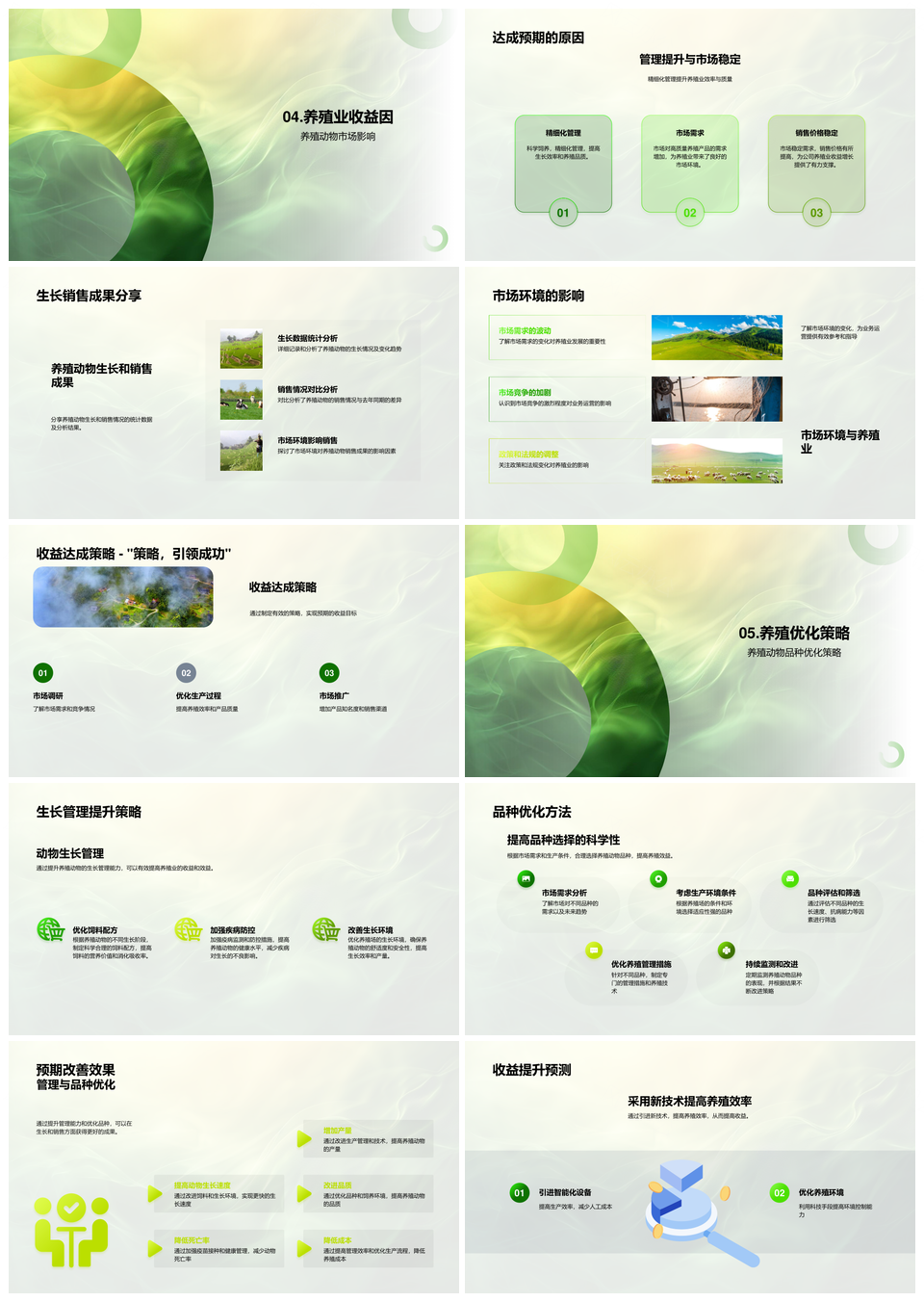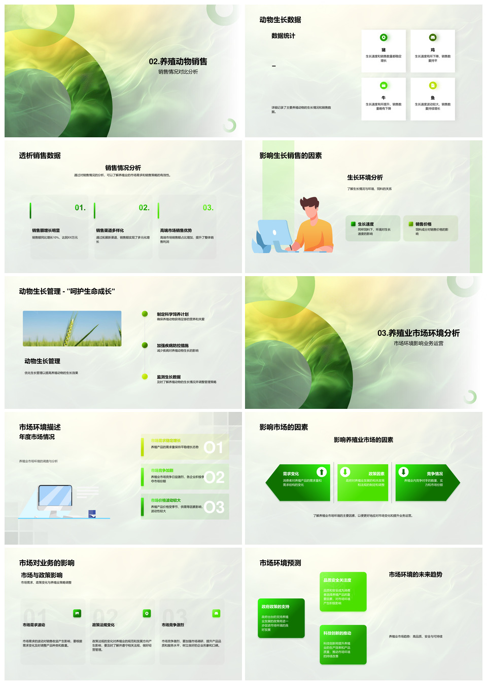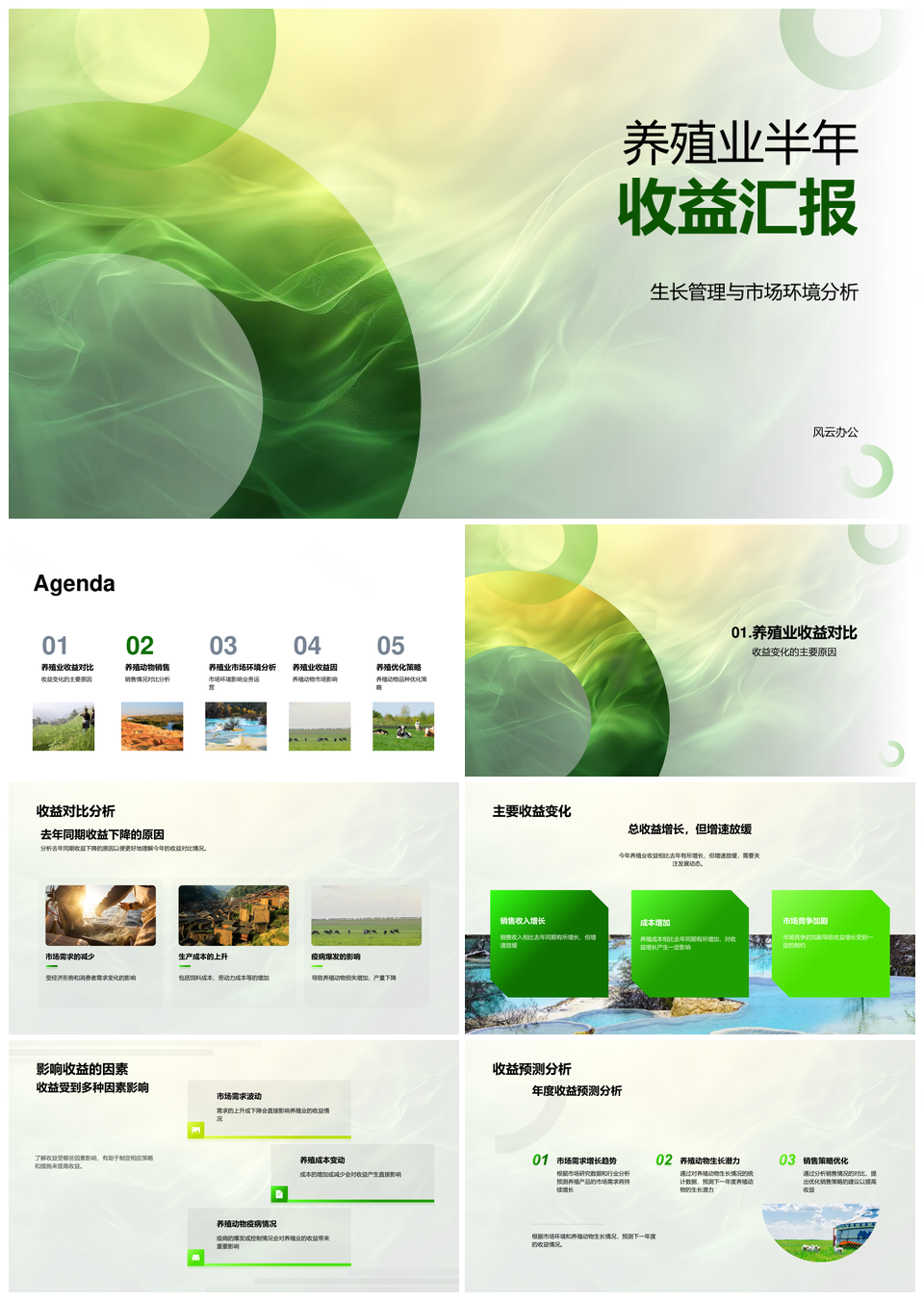 这是一张养殖业半年收益市场环境生长管理销售数据分析对比PPT模板,包含养殖业、半年收益、市场环境、生长管理、销售数据、分析对比等主题内容,也可用作养殖业半年收益市场分析、市场环境生长管理分析、销售数据对比分析、养殖业环境生长管理、半年收益对比分析、生长管理销售数据、环境数据对比分析、养殖业管理销售数据、市场销售数据对比、生长管理分析对比、半年收益环境分析、市场环境管理分析、收益管理销售数据、数据对比分析、养殖业销售数据分析等PPT场景使用。 风云办公提供的养殖业半年收益市场环境生长管理销售数据分析对比PPT模板,下载格式为pptx,一共28页,作品中文字及图均可以修改和编辑,图片更改请在作品中右键图片并更换,文字修改请直接点击文字进行修改。