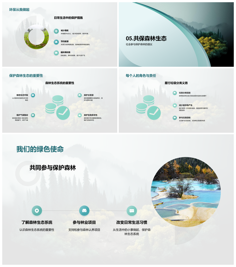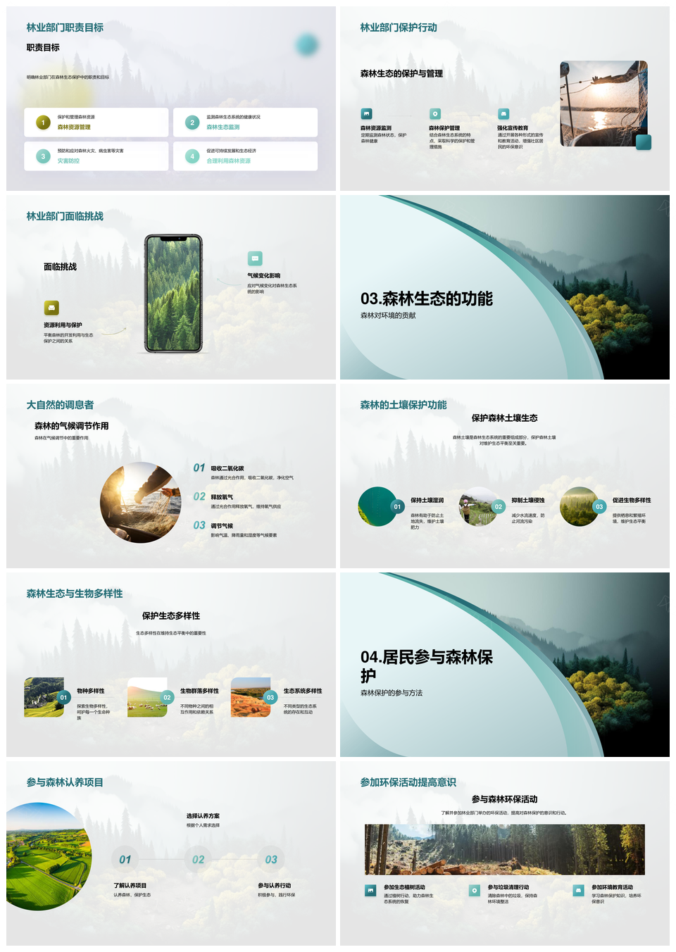 这是一张林业社区共建森林生态家园护生物多样气候土壤PPT模板,包含林业社区、共建、森林生态、家园、护、生物多样、气候、土壤等主题内容,也可用作林业社区共建森林、社区共建森林生态、共建森林生态家园、森林生态家园生物、生态家园生物多样、家园生物多样气候、生物多样气候土壤、林业社区共建、社区共建森林、共建森林生态、森林生态家园、生态家园生物、家园生物多样、生物多样气候、多样气候土壤等PPT场景使用。 风云办公提供的林业社区共建森林生态家园护生物多样气候土壤PPT模板,下载格式为pptx,一共23页,作品中文字及图均可以修改和编辑,图片更改请在作品中右键图片并更换,文字修改请直接点击文字进行修改。