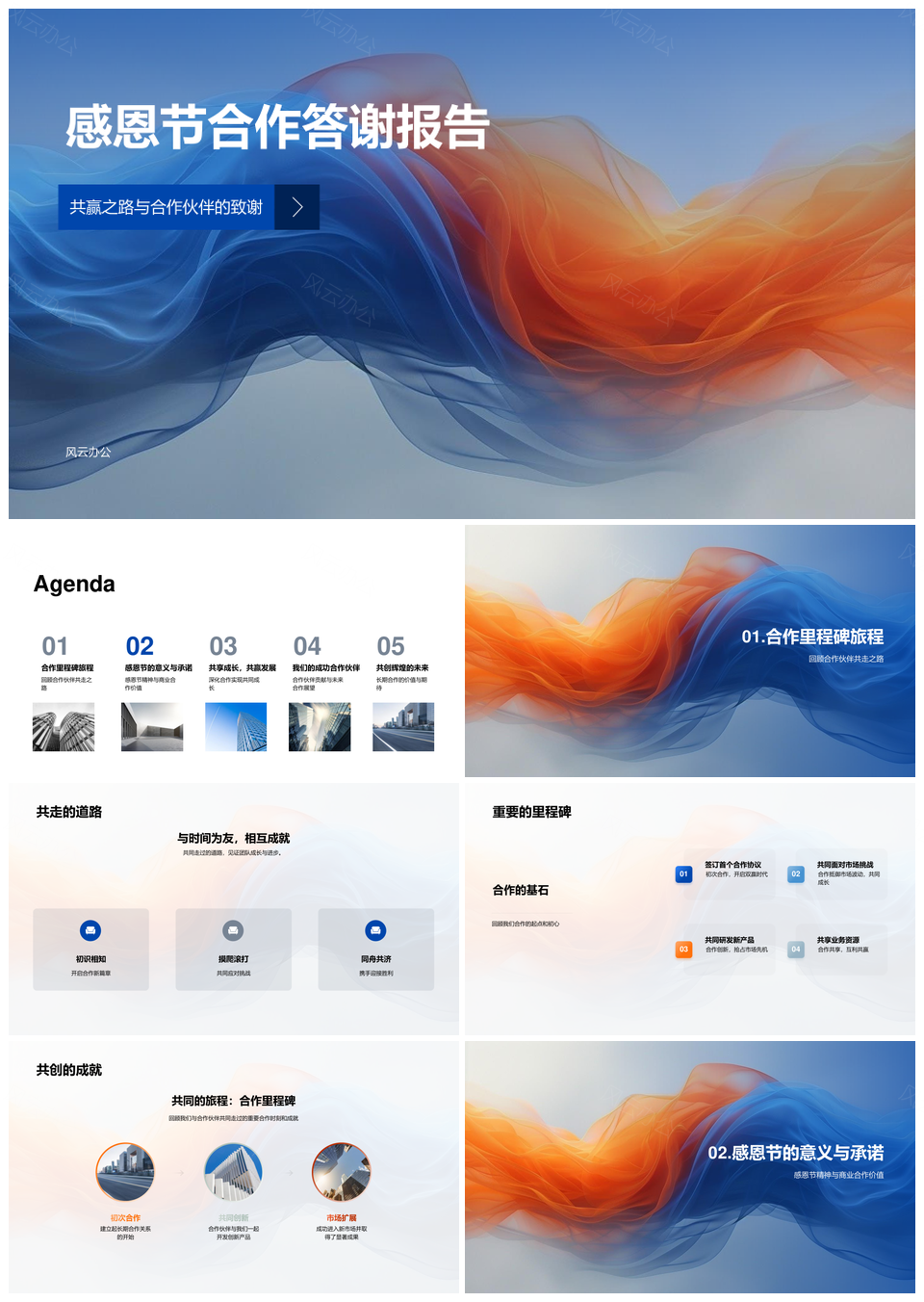 风云办公提供的感恩节合作伙伴答谢共赢之路报告PPT模板,下载格式为pptx,一共23页,作品中文字及图均可以修改和编辑,图片更改请在作品中右键图片并更换,文字修改请直接点击文字进行修改。