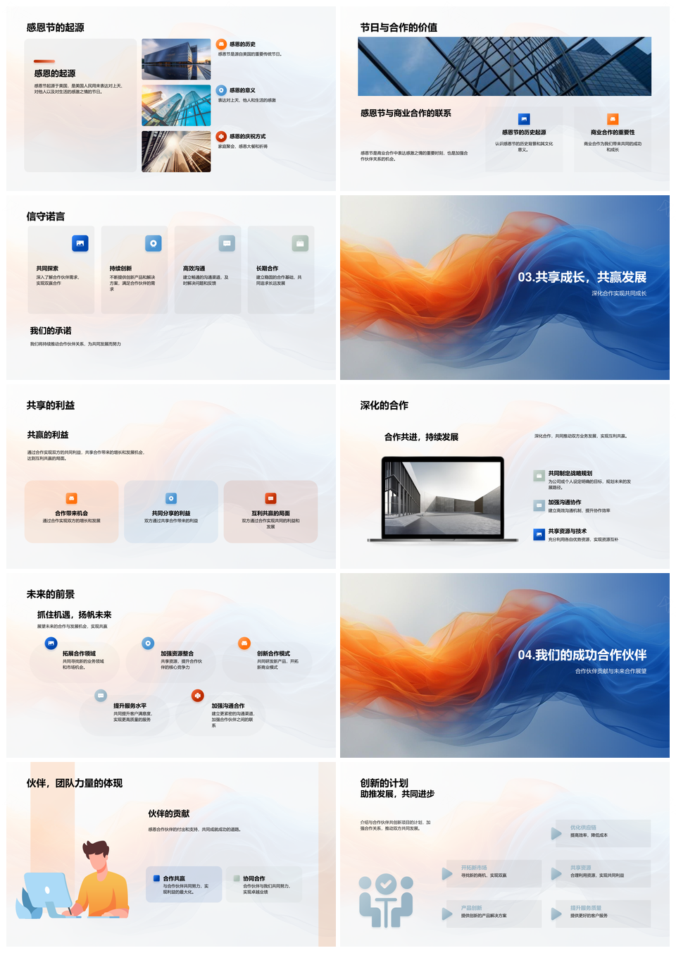这是一张感恩节合作伙伴答谢共赢之路报告PPT模板,包含感恩节、合作伙伴、答谢、共赢之路、报告等主题内容,也可用作感恩节合作伙伴答谢共赢、合作伙伴答谢共赢报告、感恩节合作伙伴答谢、合作伙伴答谢共赢、答谢共赢报告、感恩节答谢共赢、合作伙伴共赢报告、感恩节合作伙伴、合作伙伴答谢、答谢共赢、共赢报告、合作伙伴共赢、感恩节答谢、感恩节共赢、答谢报告等PPT场景使用。