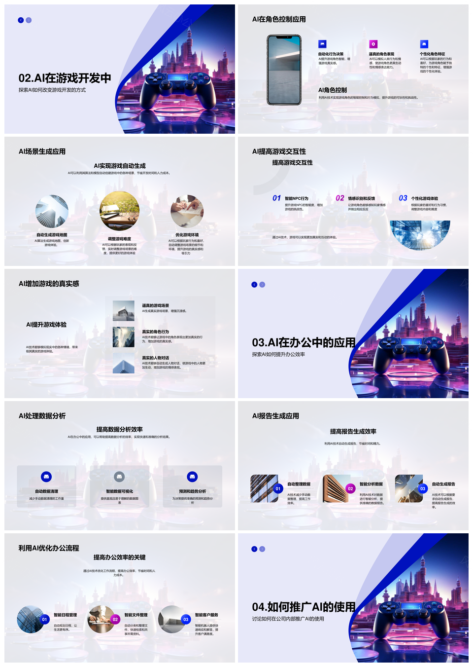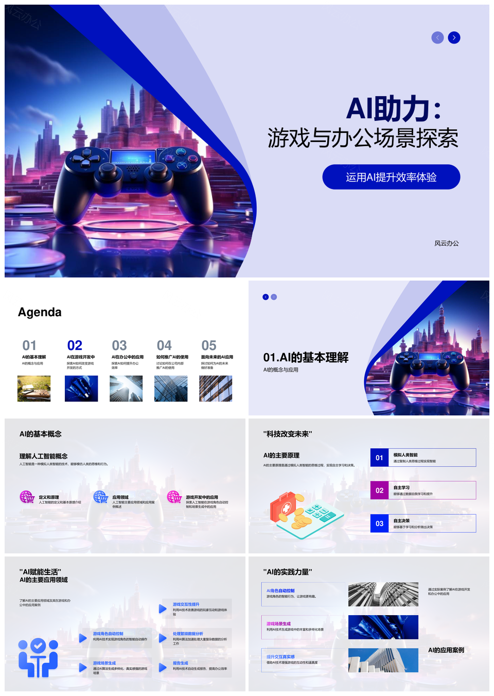 风云办公提供的AI应用赋能游戏开发与办公高效PPT模板,下载格式为pptx,一共25页,作品中文字及图均可以修改和编辑,图片更改请在作品中右键图片并更换,文字修改请直接点击文字进行修改。