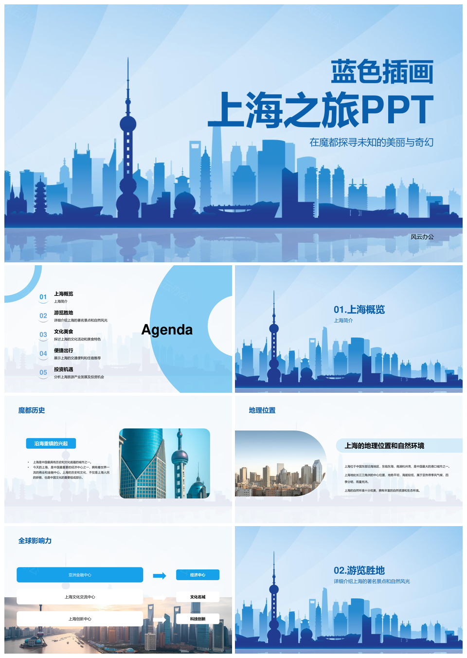 风云办公提供的蓝色插画上海旅游东方明珠建筑相册PPT模板,下载格式为pptx,一共21页,作品中文字及图均可以修改和编辑,图片更改请在作品中右键图片并更换,文字修改请直接点击文字进行修改。
