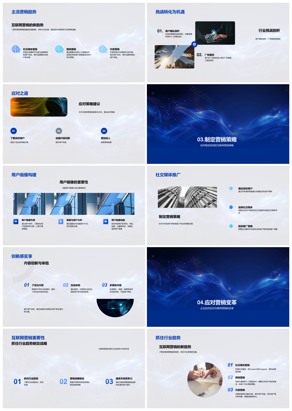 这是一张互联网营销策略实战案例挑战用户画像精准内容社交PPT模板,包含互联网、营销策略、实战案例、挑战、用户画像、精准内容、社交等主题内容,也可用作互联网营销策略实战案例挑战、用户画像精准内容社交、互联网营销策略实战、营销策略实战案例挑战、实战案例挑战用户画像、用户画像精准内容、精准内容社交挑战、互联网营销策略实战案例、案例挑战用户画像精准、精准内容社交营销、用户画像精准社交、实战案例挑战精准、营销策略精准内容、用户画像社交挑战、互联网营销策略案例等PPT场景使用。 风云办公提供的互联网营销策略实战案例挑战用户画像精准内容社交PPT模板,下载格式为pptx,一共23页,作品中文字及图均可以修改和编辑,图片更改请在作品中右键图片并更换,文字修改请直接点击文字进行修改。