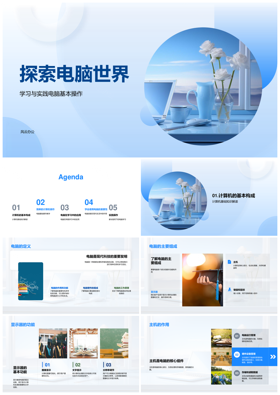风云办公提供的探索电脑构成与基本操作世界PPT模板,下载格式为pptx,一共33页,作品中文字及图均可以修改和编辑,图片更改请在作品中右键图片并更换,文字修改请直接点击文字进行修改。