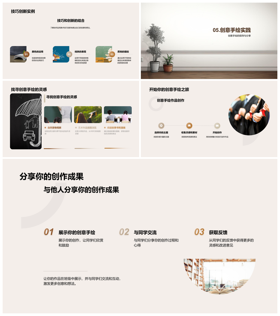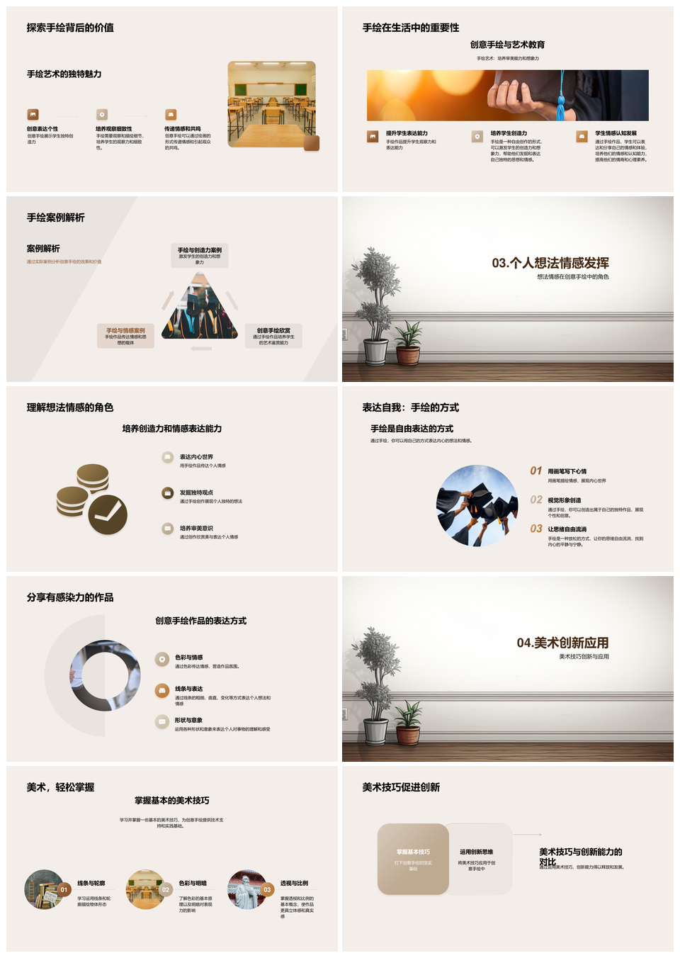 风云办公提供的创意手绘艺术教育创新技巧情感表达PPT模板,下载格式为pptx,一共23页,作品中文字及图均可以修改和编辑,图片更改请在作品中右键图片并更换,文字修改请直接点击文字进行修改。