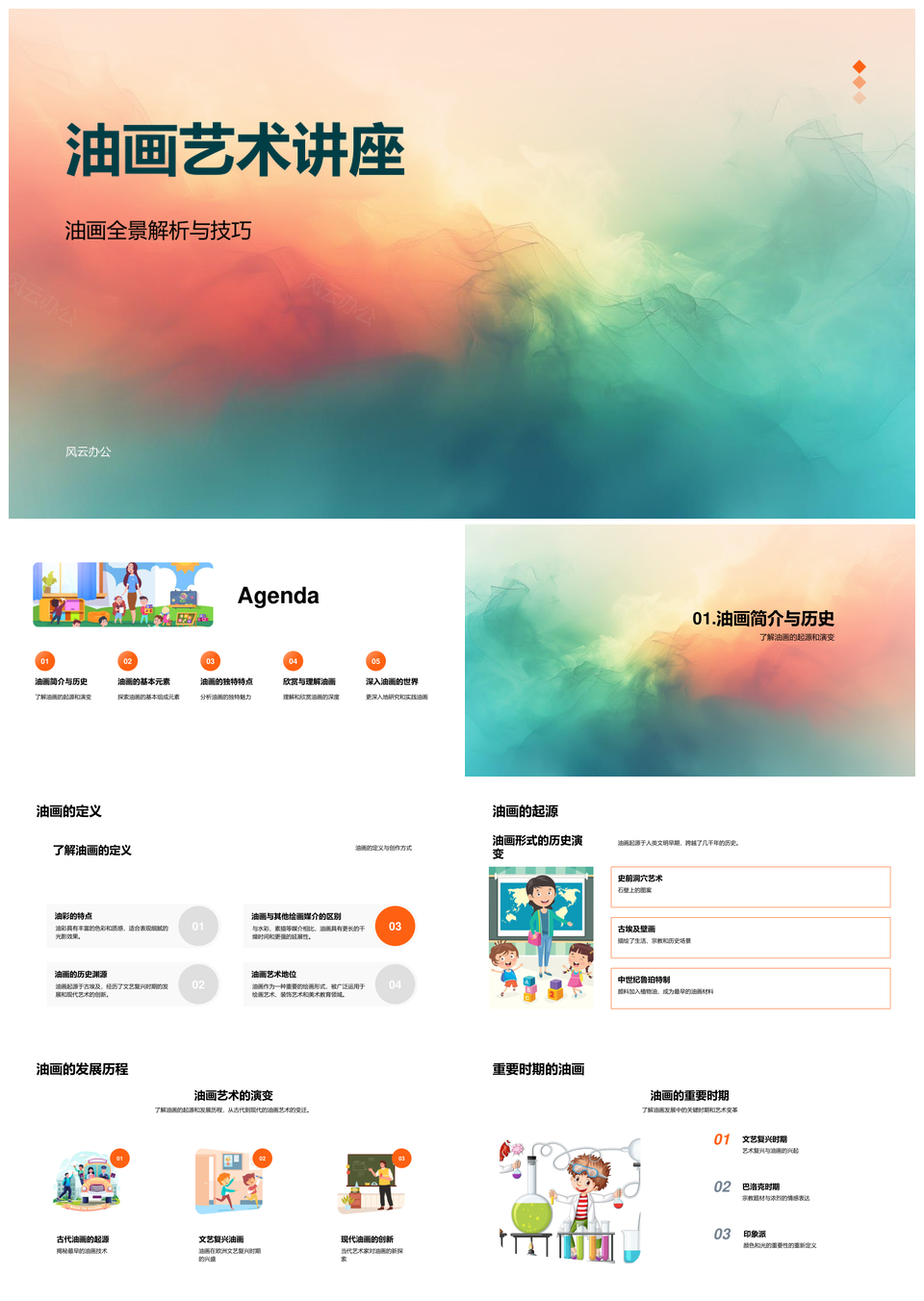 这是一张油画艺术源起材料工具技法调色质感解析PPT模板,包含油画艺术、源起、材料、工具、技法、调色、质感、解析等主题内容,也可用作油画艺术源起材料、艺术源起材料工具、源起材料工具技法、材料工具技法调色、工具技法调色质感、技法调色质感解析、油画艺术材料工具、油画艺术技法调色、艺术材料技法调色、材料工具调色质感、艺术技法调色质感、油画材料工具技法、艺术工具技法调色、油画技法调色质感、技法调色质感等PPT场景使用。 风云办公提供的油画艺术源起材料工具技法调色质感解析PPT模板,下载格式为pptx,一共33页,作品中文字及图均可以修改和编辑,图片更改请在作品中右键图片并更换,文字修改请直接点击文字进行修改。