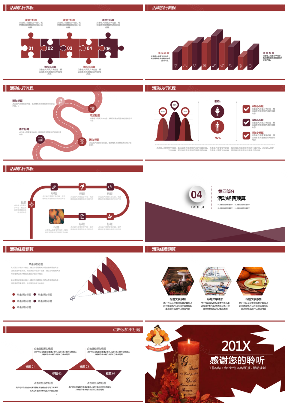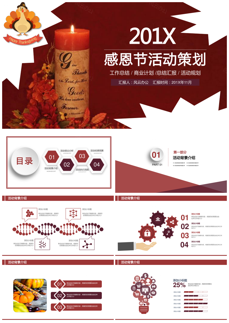 这是一张感恩节活动策划PPT模板,包含感恩节、活动、策划等主题内容,也可用作感恩节、活动、策划 感恩节活动策划、感恩节活动、感恩节策划、活动策划等PPT场景使用。 风云办公提供的感恩节活动策划PPT模板,下载格式为pptx,一共27页,作品中文字及图均可以修改和编辑,图片更改请在作品中右键图片并更换,文字修改请直接点击文字进行修改。
