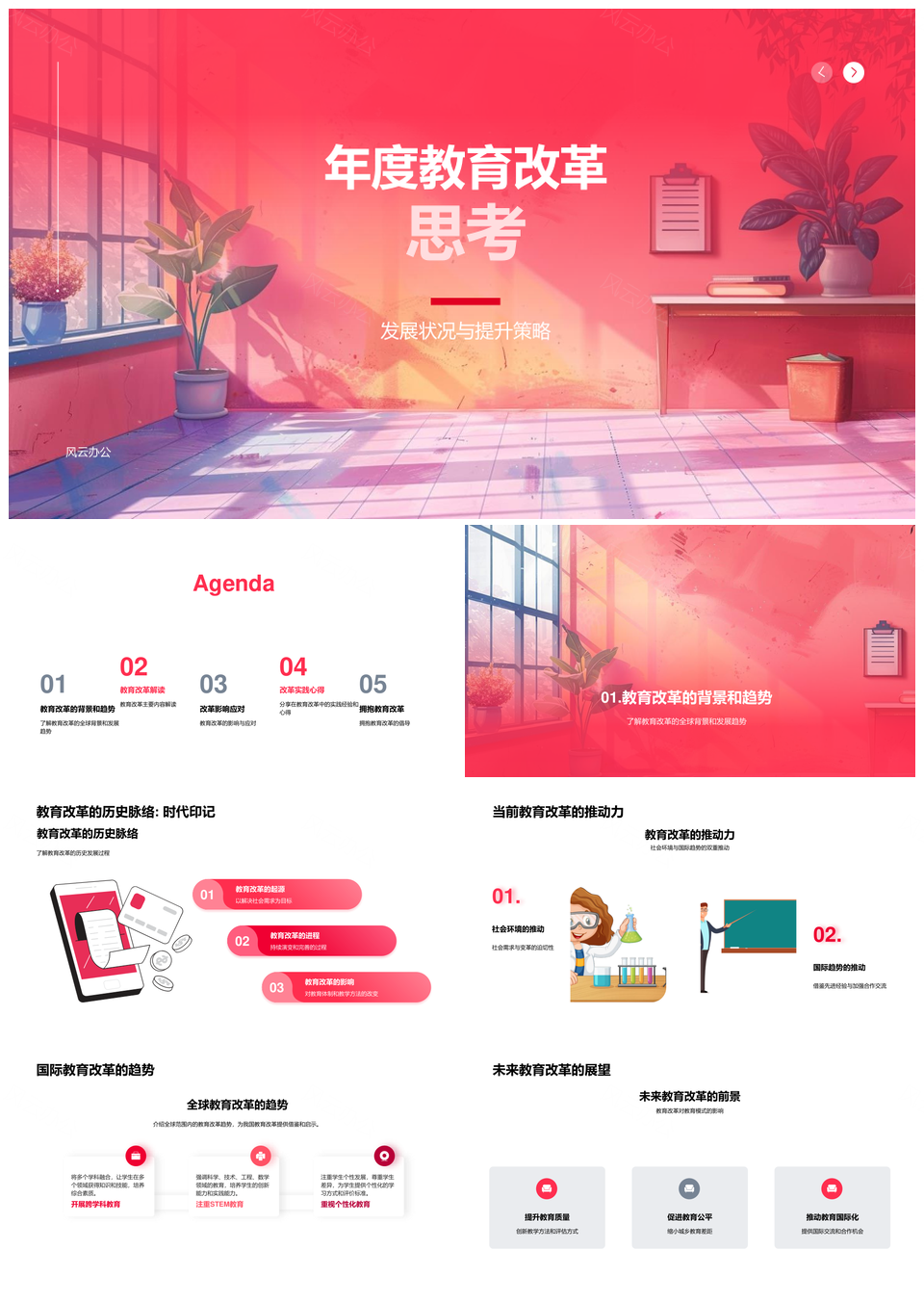 风云办公提供的教育改革发展现状提升策略国际趋势PPT模板,下载格式为pptx,一共25页,作品中文字及图均可以修改和编辑,图片更改请在作品中右键图片并更换,文字修改请直接点击文字进行修改。