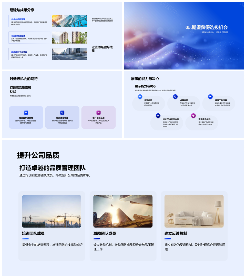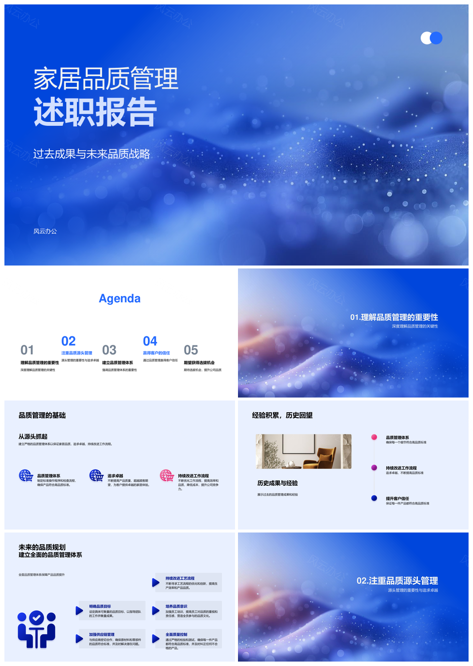 这是一张家居品质管理述职战略体系经验规划标准PPT模板,包含家居、品质管理、述职、战略体系、经验、规划、标准等主题内容,也可用作家居品质管理战略、家居品质管理体系、品质管理战略体系、管理述职战略体系、战略体系经验规划、体系经验规划标准、家居品质管理、品质管理战略、管理体系经验、战略体系经验、体系经验规划、经验规划标准、家居品质、品质管理、战略体系等PPT场景使用。 风云办公提供的家居品质管理述职战略体系经验规划标准PPT模板,下载格式为pptx,一共23页,作品中文字及图均可以修改和编辑,图片更改请在作品中右键图片并更换,文字修改请直接点击文字进行修改。
