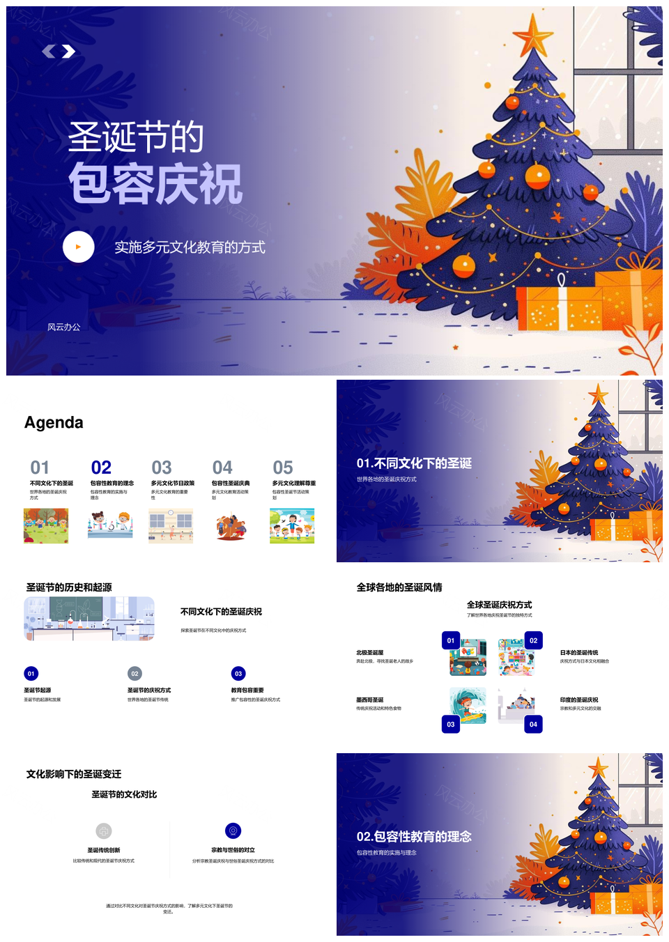 风云办公提供的多元包容教育圣诞全球传统庆典策划PPT模板,下载格式为pptx,一共23页,作品中文字及图均可以修改和编辑,图片更改请在作品中右键图片并更换,文字修改请直接点击文字进行修改。