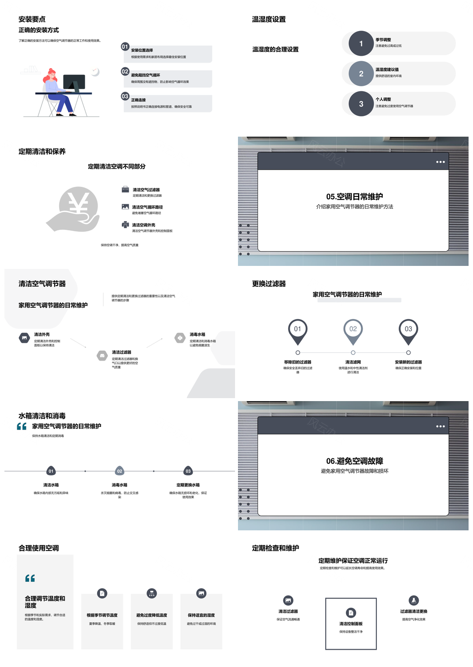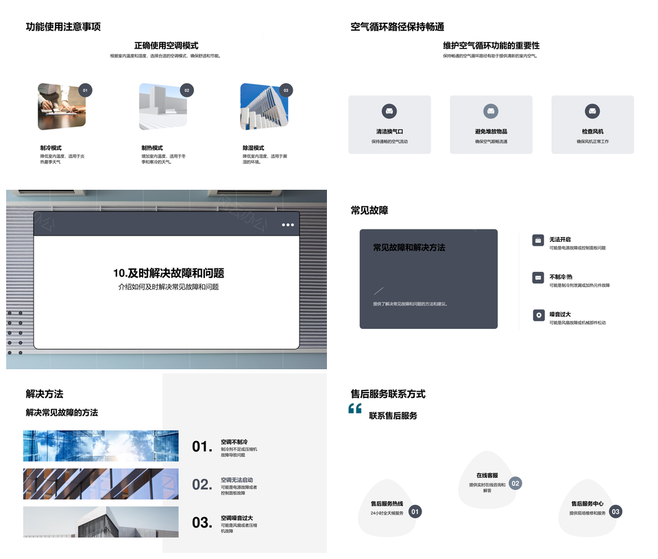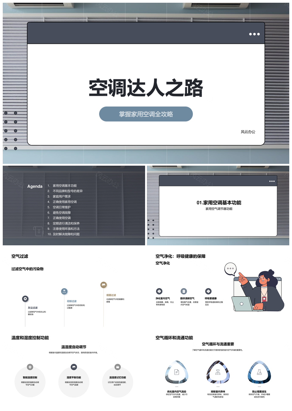 风云办公提供的家用空调空气净化温湿度控制使用指南PPT模板,下载格式为pptx,一共44页,作品中文字及图均可以修改和编辑,图片更改请在作品中右键图片并更换,文字修改请直接点击文字进行修改。