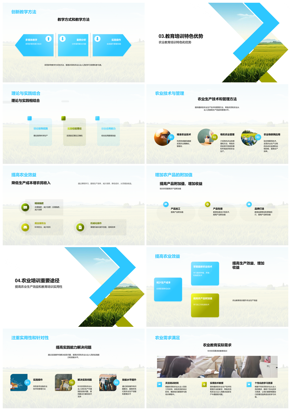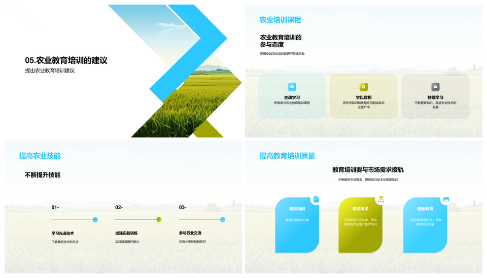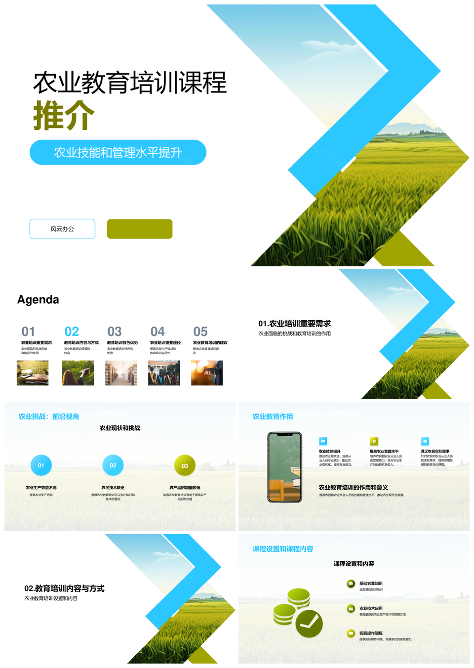风云办公提供的农业技能与管理水平教育培训课程推介PPT模板,下载格式为pptx,一共22页,作品中文字及图均可以修改和编辑,图片更改请在作品中右键图片并更换,文字修改请直接点击文字进行修改。