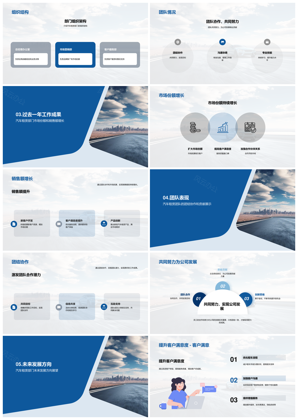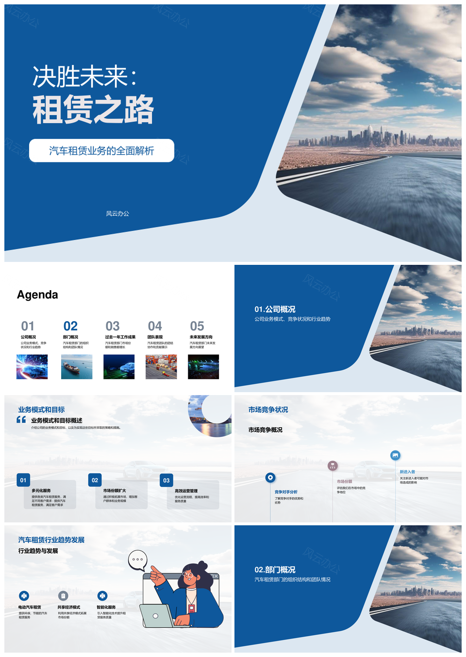 风云办公提供的汽车租赁部门年度总结与未来展望PPT模板,下载格式为pptx,一共20页,作品中文字及图均可以修改和编辑,图片更改请在作品中右键图片并更换,文字修改请直接点击文字进行修改。