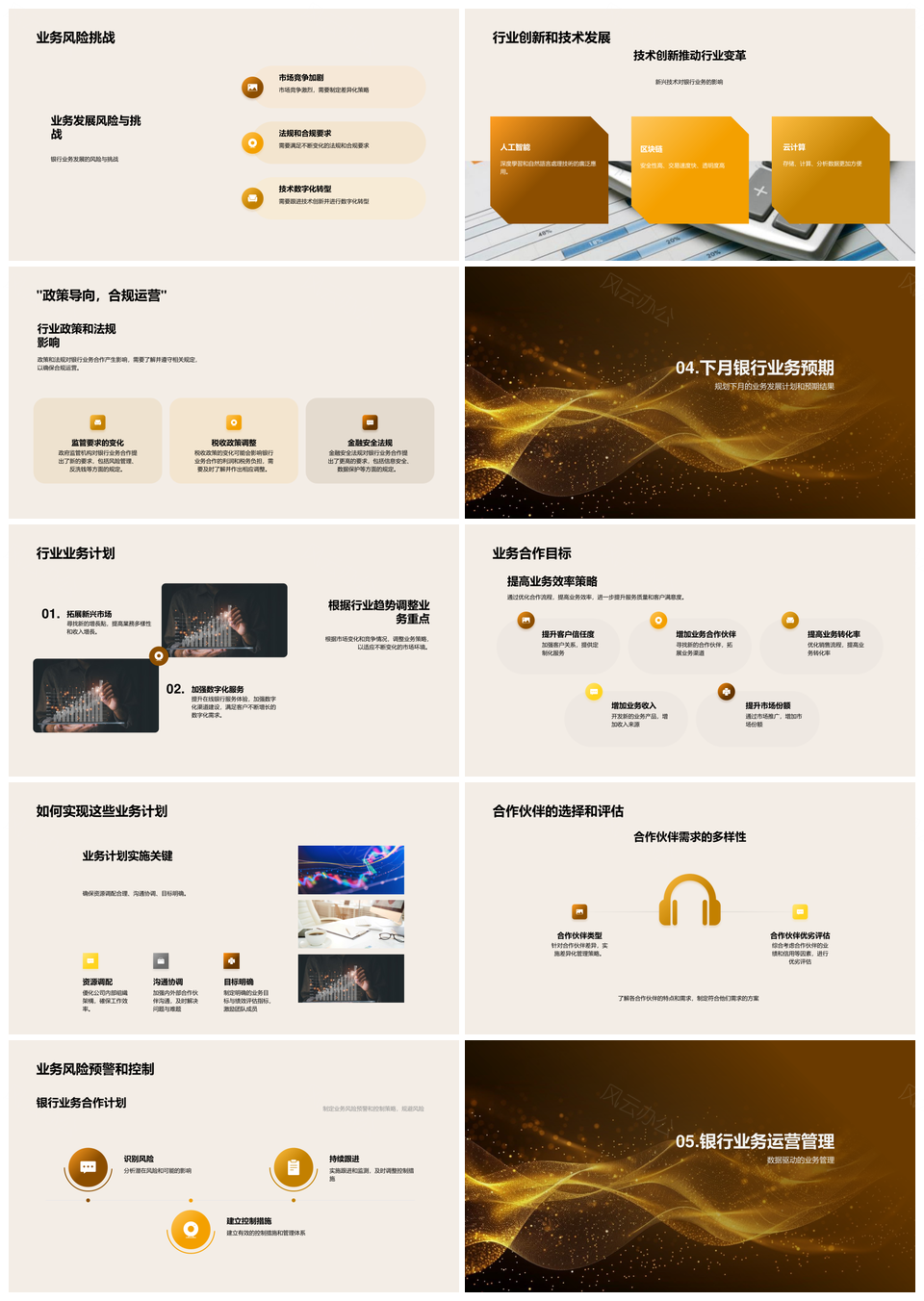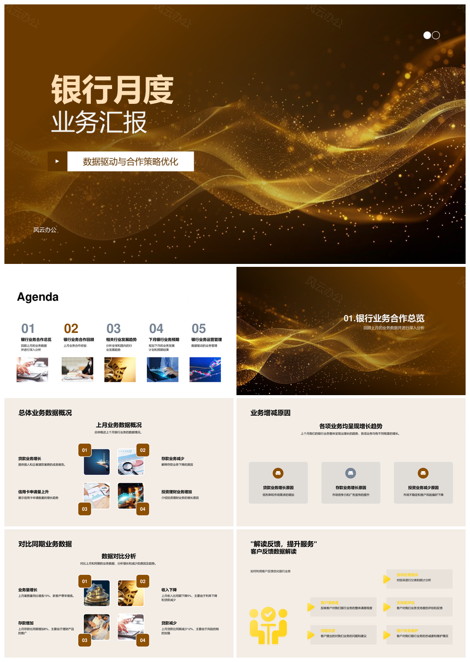 这款金色主题模板专为银行及金融机构月度汇报场景设计,以金属质感渐变背景为基底,强化数据展示的专业性与可信度,科学光效结合波粒二象性动态线条,理性呈现业务数据的流动轨迹与内在关联。激光切割感的立体图表模块,适配财务指标、业务增长等核心数据的高效可视化,阶梯式递进页面逻辑,确保信息传达的严谨度,金属镶边的分栏布局兼顾多维度数据对比分析需求,通过克制而精准的视觉层次,传递金融从业者的专业态度与务实精神。