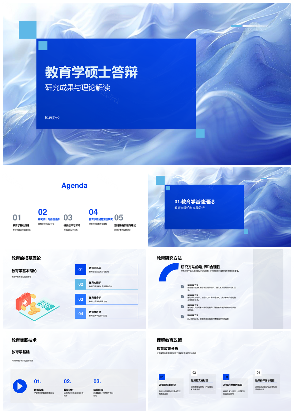 风云办公提供的教育学硕士答辩理论方法政策实践研究PPT模板,下载格式为pptx,一共33页,作品中文字及图均可以修改和编辑,图片更改请在作品中右键图片并更换,文字修改请直接点击文字进行修改。